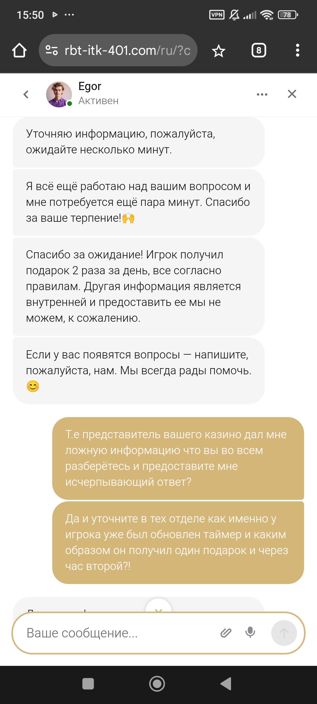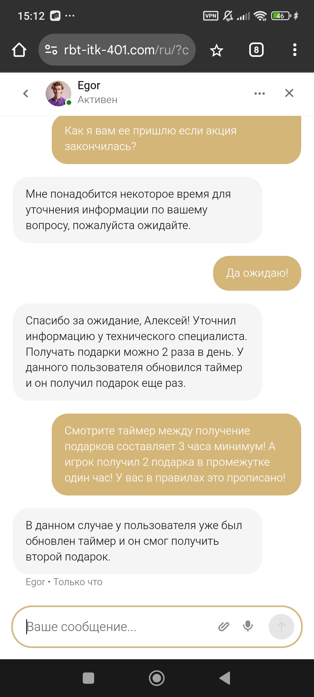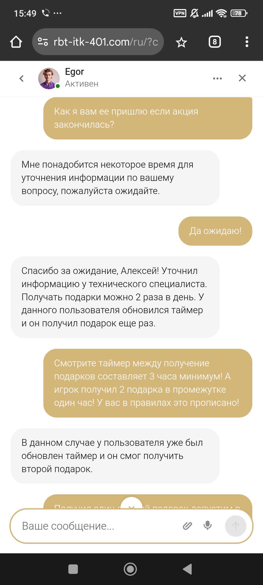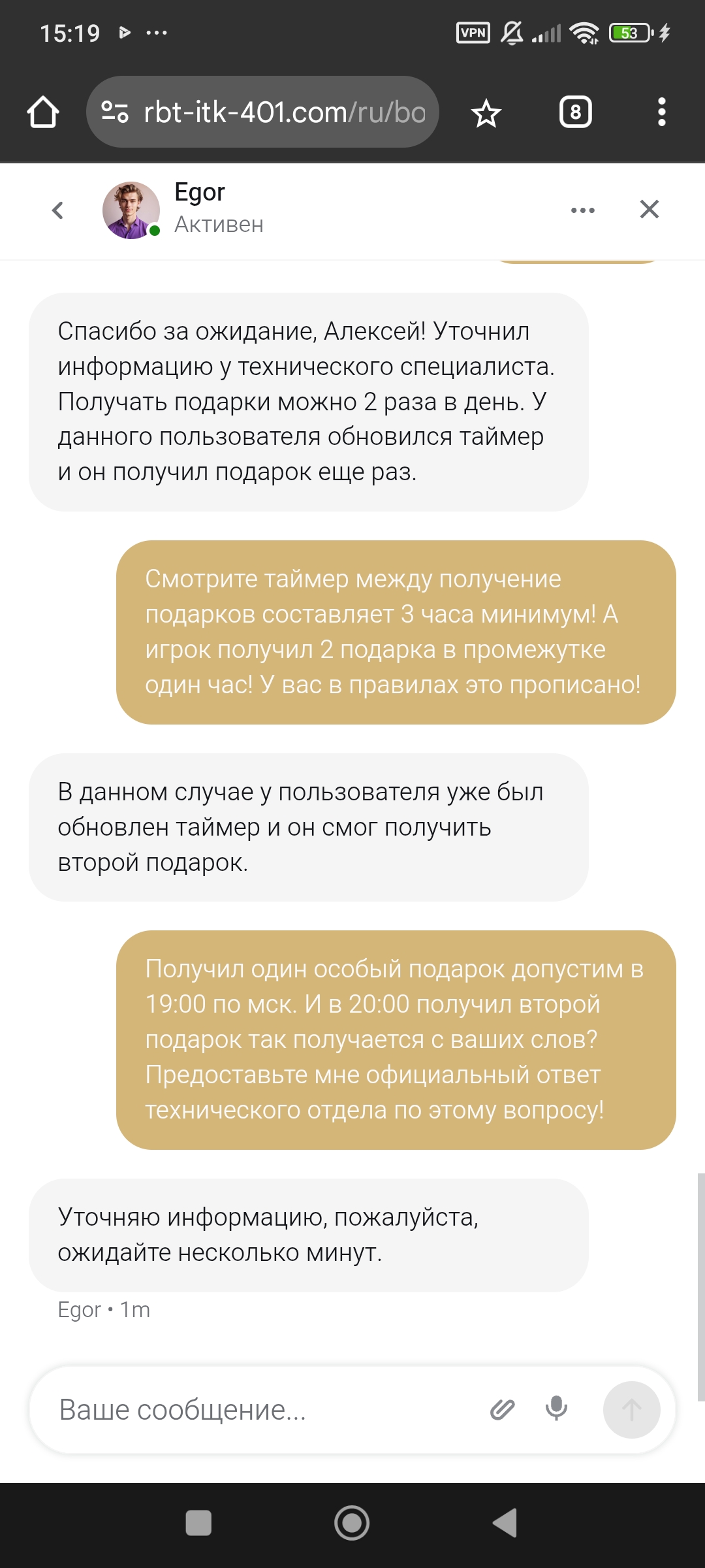 УВ представитель о такой проверке вы заявляли? И о таком исчерпывающим ответом вы мне грозили?вот ваша поддержка почитайте эту откровенную ложь! Один оператор заявляет что все нормально игрок получил один приз! Второй заявляет что у игрока был уже был обновлен таймер и он получил 2 подарка в отрезке часа времени! Так это у меня браузер врёт? Или вы там обманываете игроков? Это прямой обман!первый скрин моего обращения в поддержку первого числа оператор Ольга! Остальные мое обращение сегодня! Вопрос один и тот же! Ответы операторов просто повергли в шок!