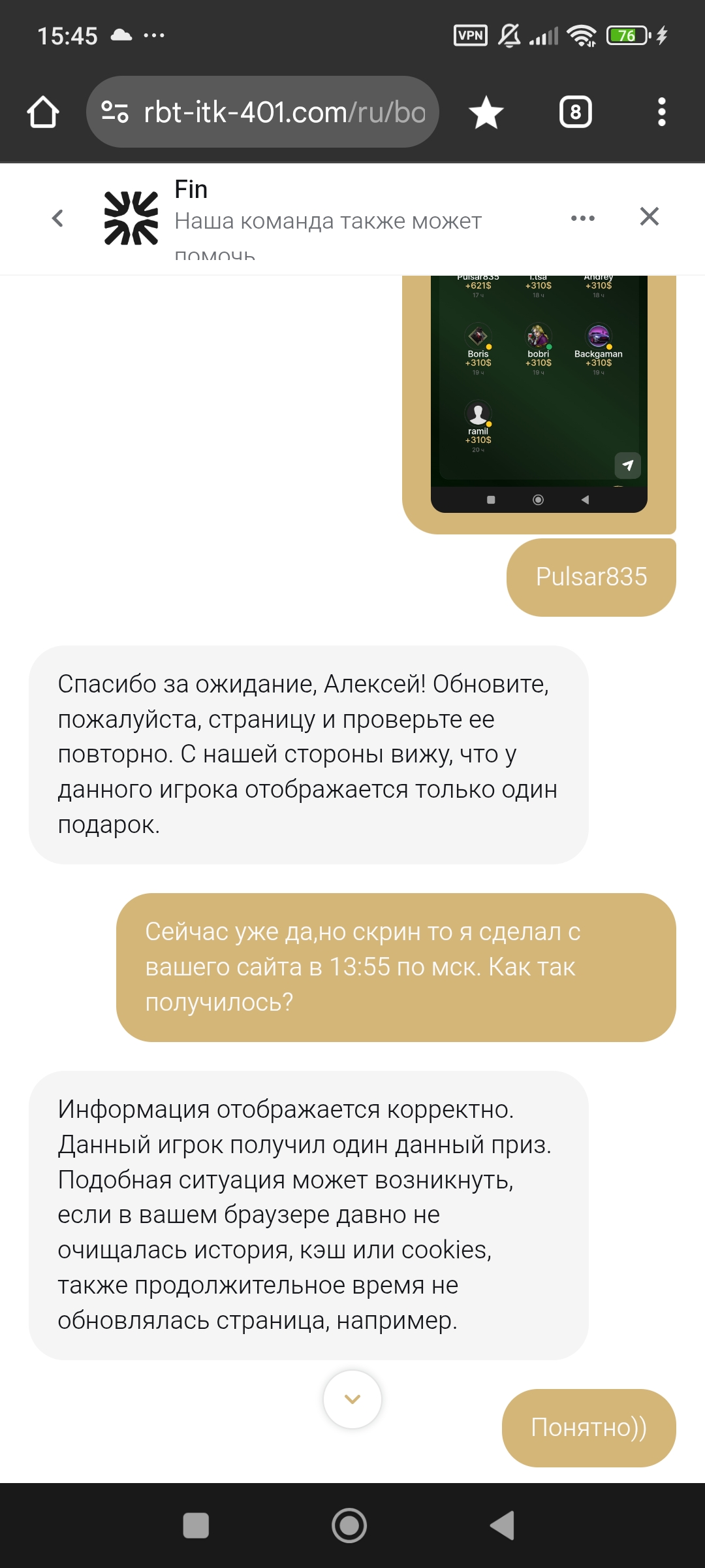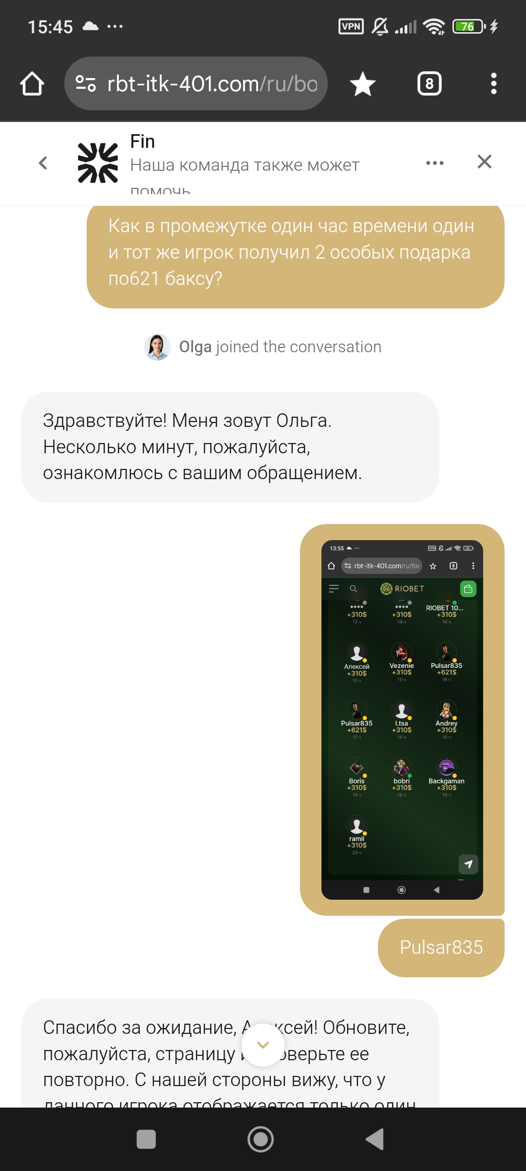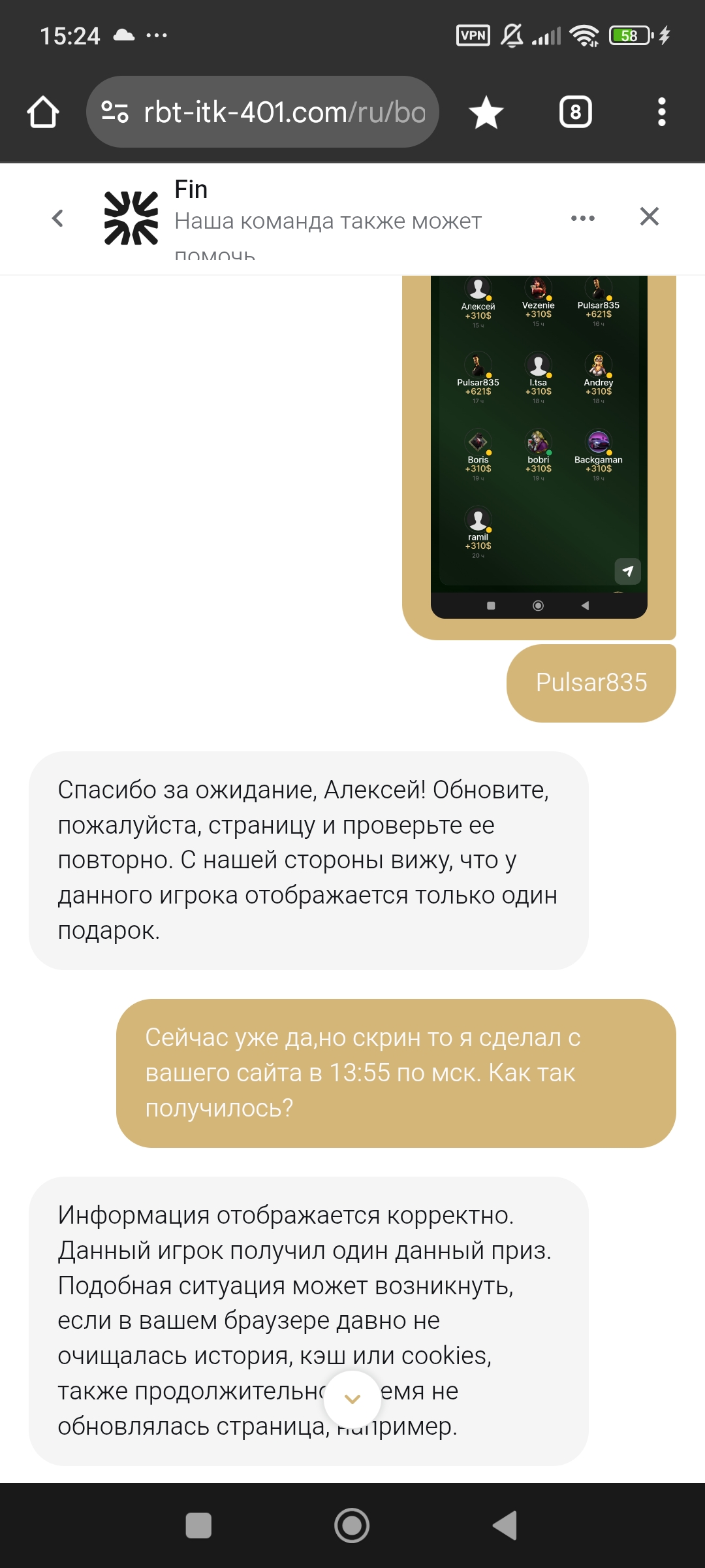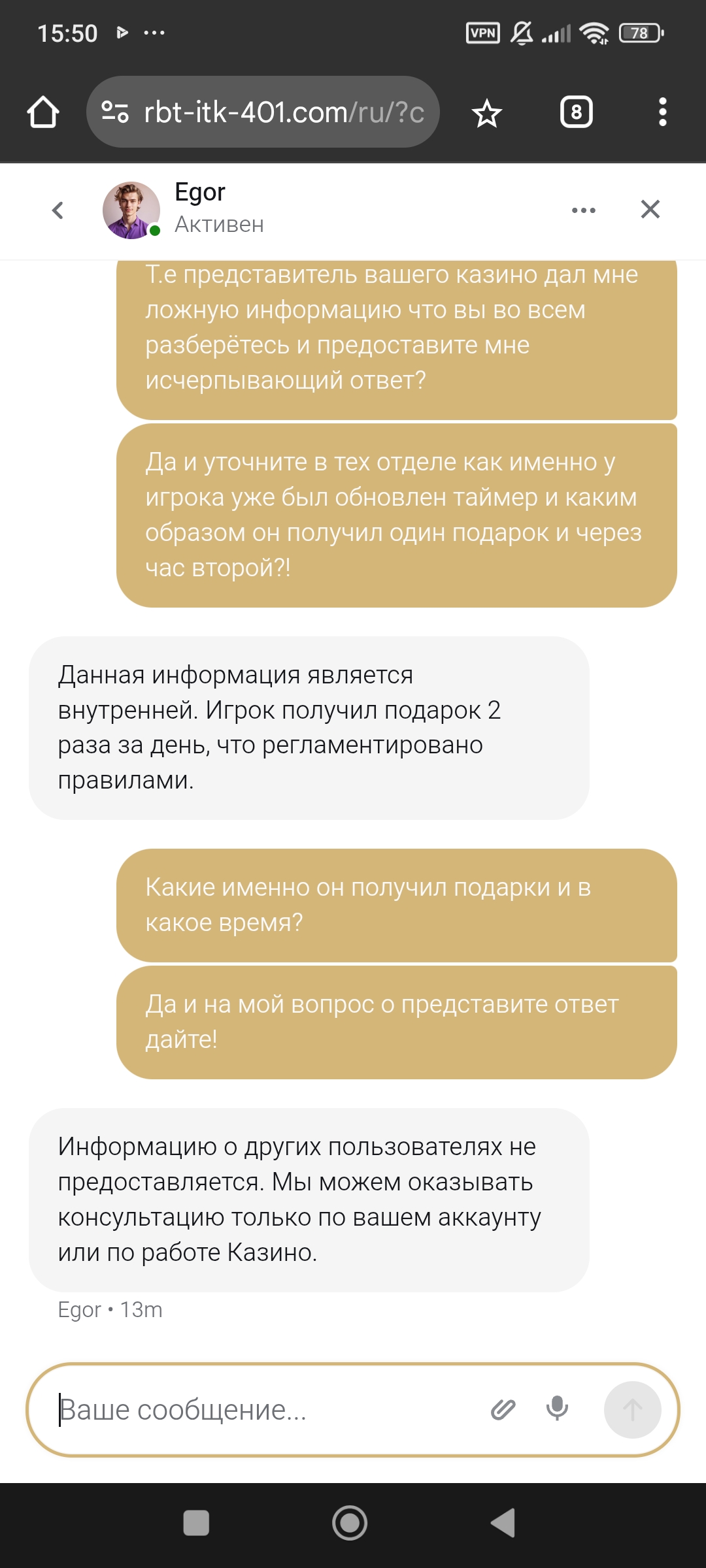 УВ представитель о такой проверке вы заявляли? И о таком исчерпывающим ответом вы мне грозили?вот ваша поддержка почитайте эту откровенную ложь! Один оператор заявляет что все нормально игрок получил один приз! Второй заявляет что у игрока был уже был обновлен таймер и он получил 2 подарка в отрезке часа времени! Так это у меня браузер врёт? Или вы там обманываете игроков? Это прямой обман!первый скрин моего обращения в поддержку первого числа оператор Ольга! Остальные мое обращение сегодня! Вопрос один и тот же! Ответы операторов просто повергли в шок!