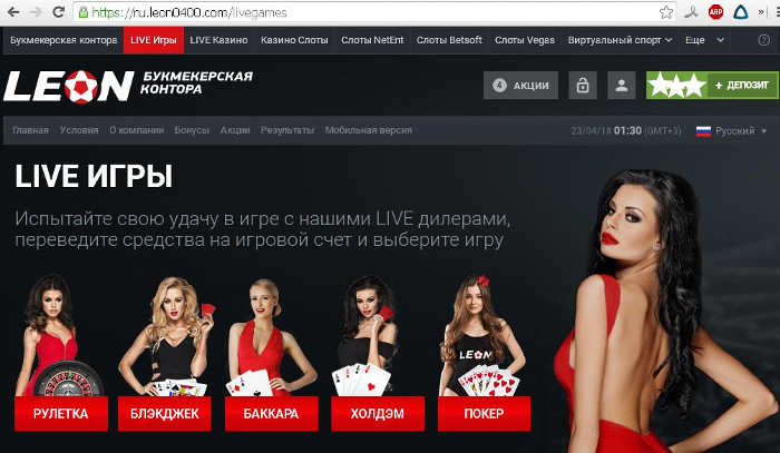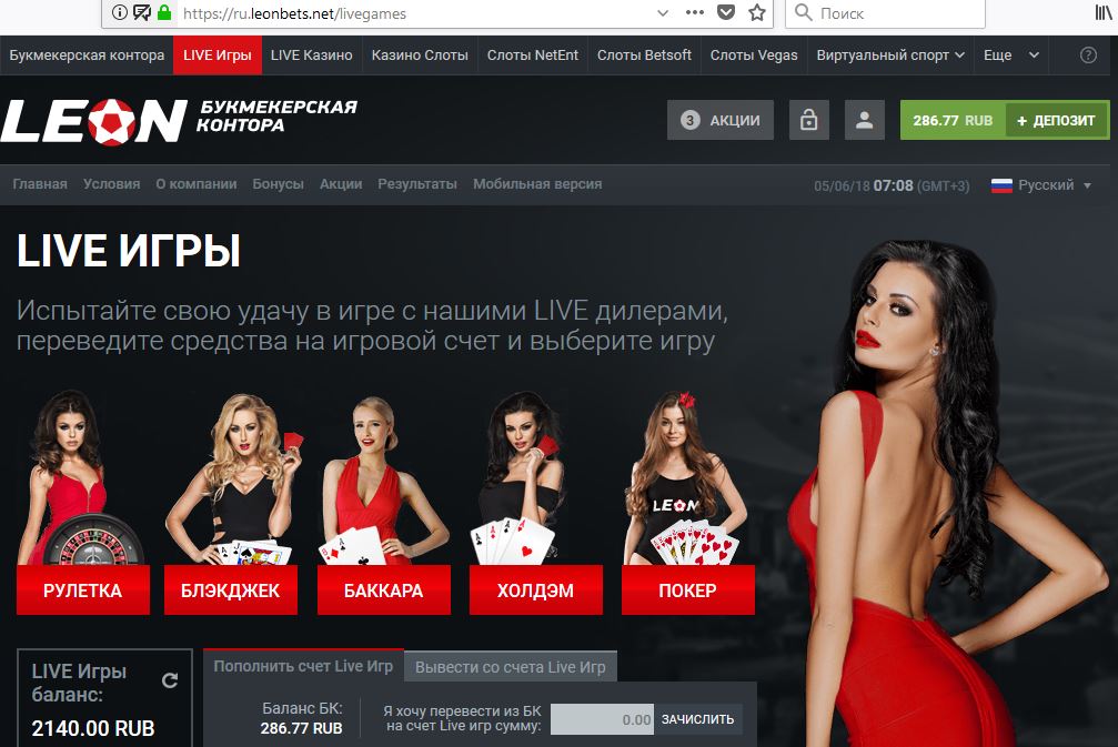 БК Леон мне понравилось своими лайв играми… Там есть и Рулетка и Баккара и БлекДжек ну и покер конечно как без него… Да много там еще шо есть, уже начал разбираться. Прикольно то, шо мин деп от 1 рубля а вывод от 100р, если кому интересно конеШно.
