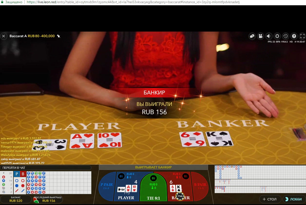 Решил продолжить но уже на баккаре с дилерами и конечно БК «Леон» сделал один «удар»… Почти удвоился… это я хорошо зашел, хотя минимальная ставка от 80 рублей была, но рискнул… А риск, как известно дело благородное