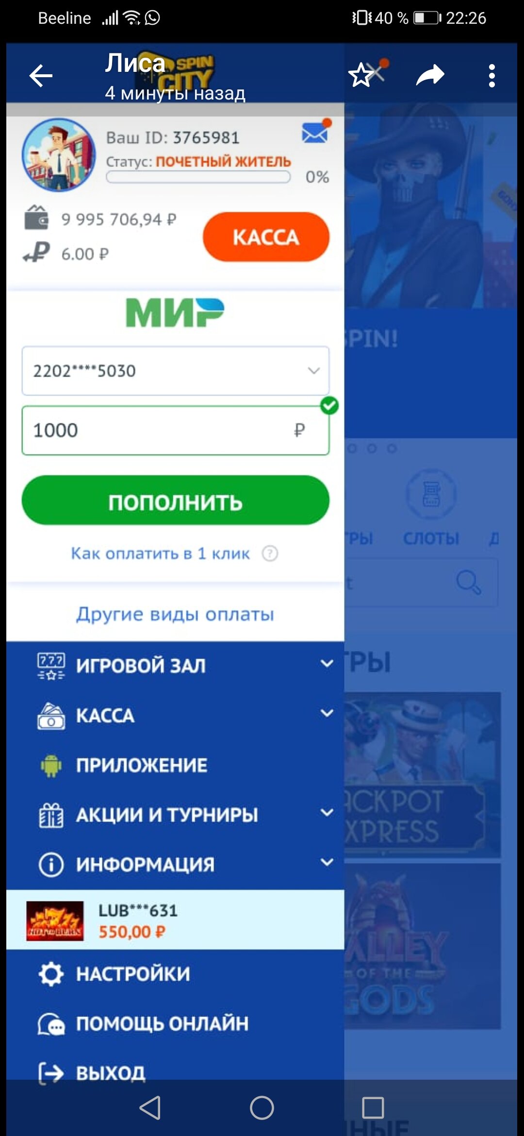 Женщина не сильна в интернете, попросила помочь ей. Но видя количество подобных случаев в этом казино думаю что бесполезно рассчитывать на 9 млн рублей ей))