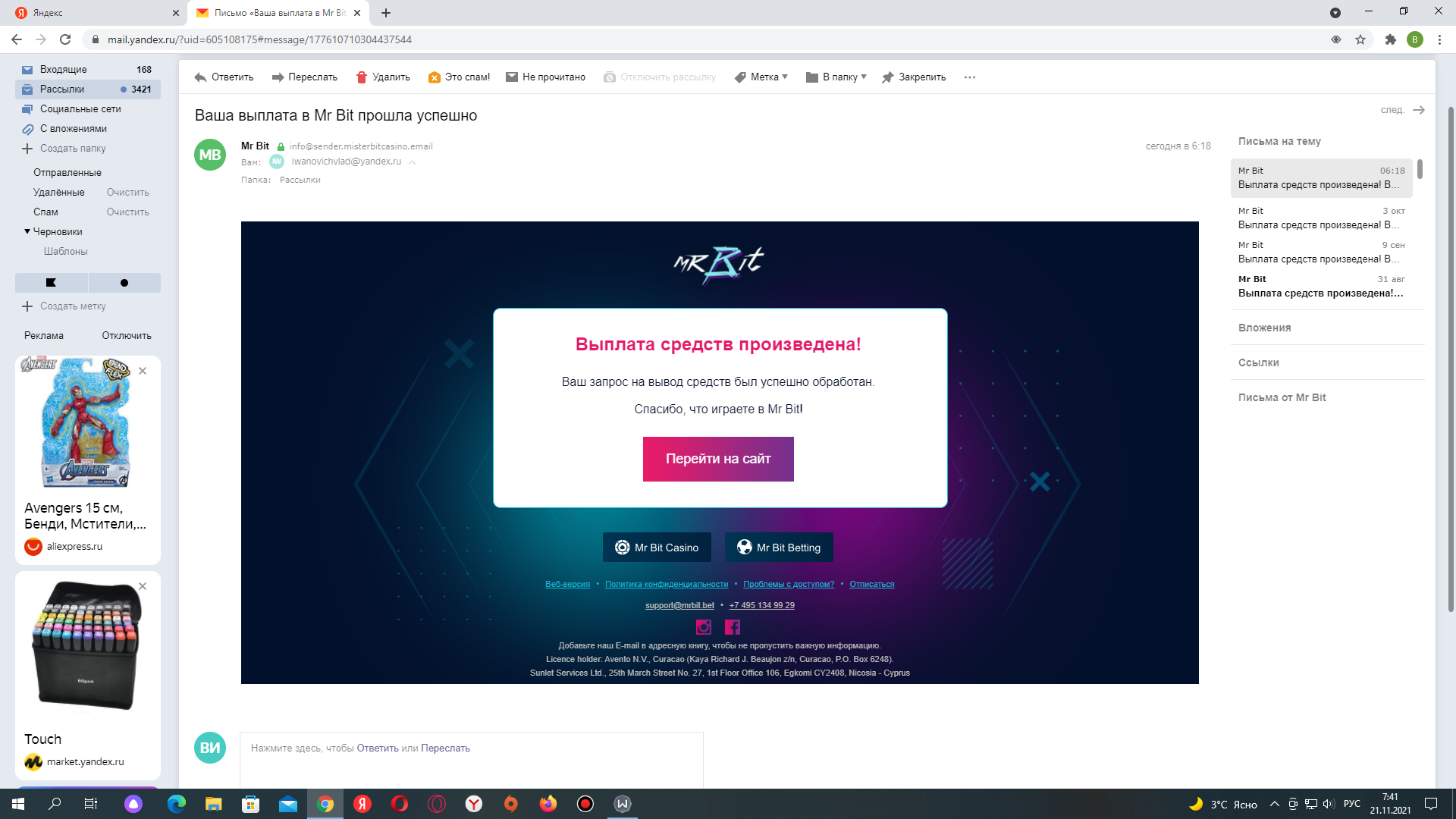 вставил вывод, а то многие говорят что здесь не выводят, жаль что это казино закрывают для русских…