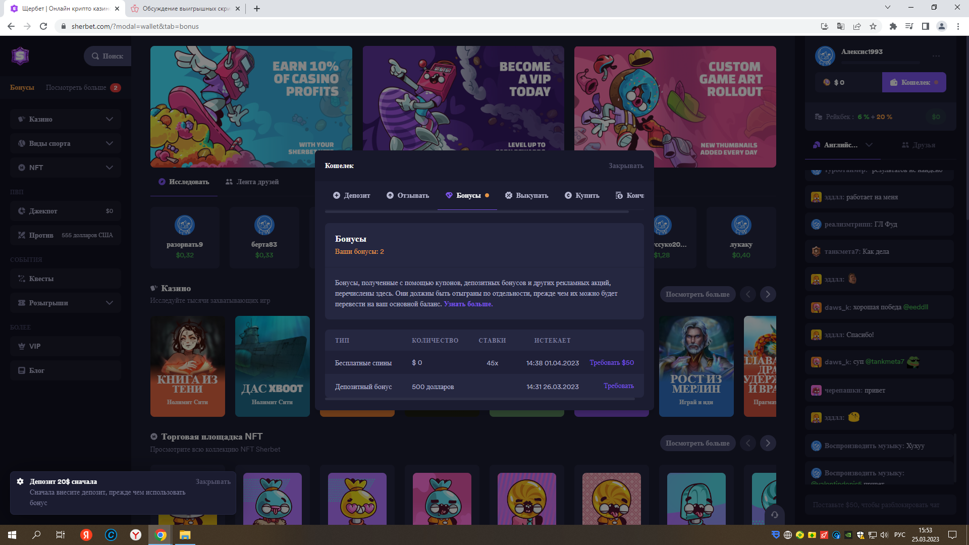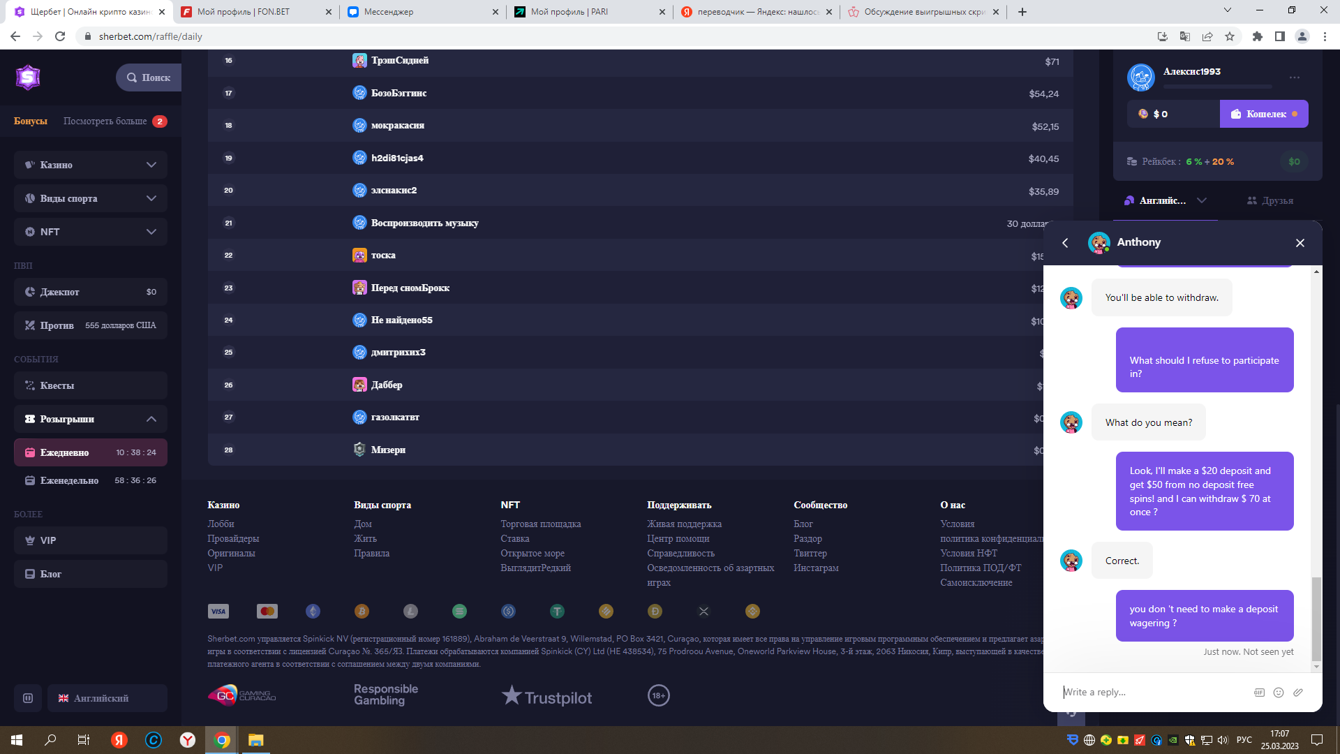 Дополняю информацию чтоб вывести! или же даже получить 50 долларов которые отыграл необходимо сделать депозит в 20 долларов которых у меня соотвественно нет (
