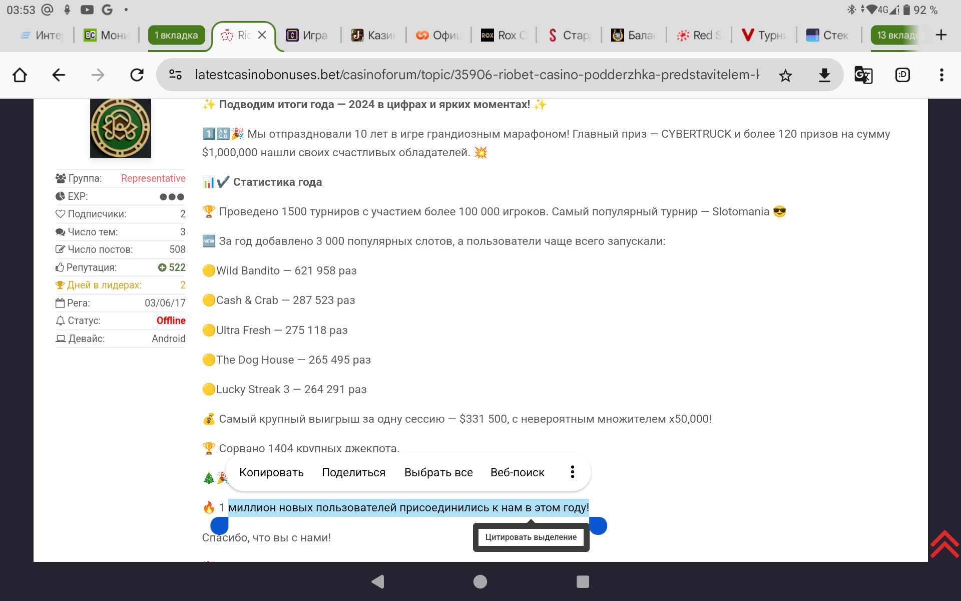 🏆 Проведено 1500 турниров с участием более 100 000 игроков. Самый популярный турнир — Slotomania 😎