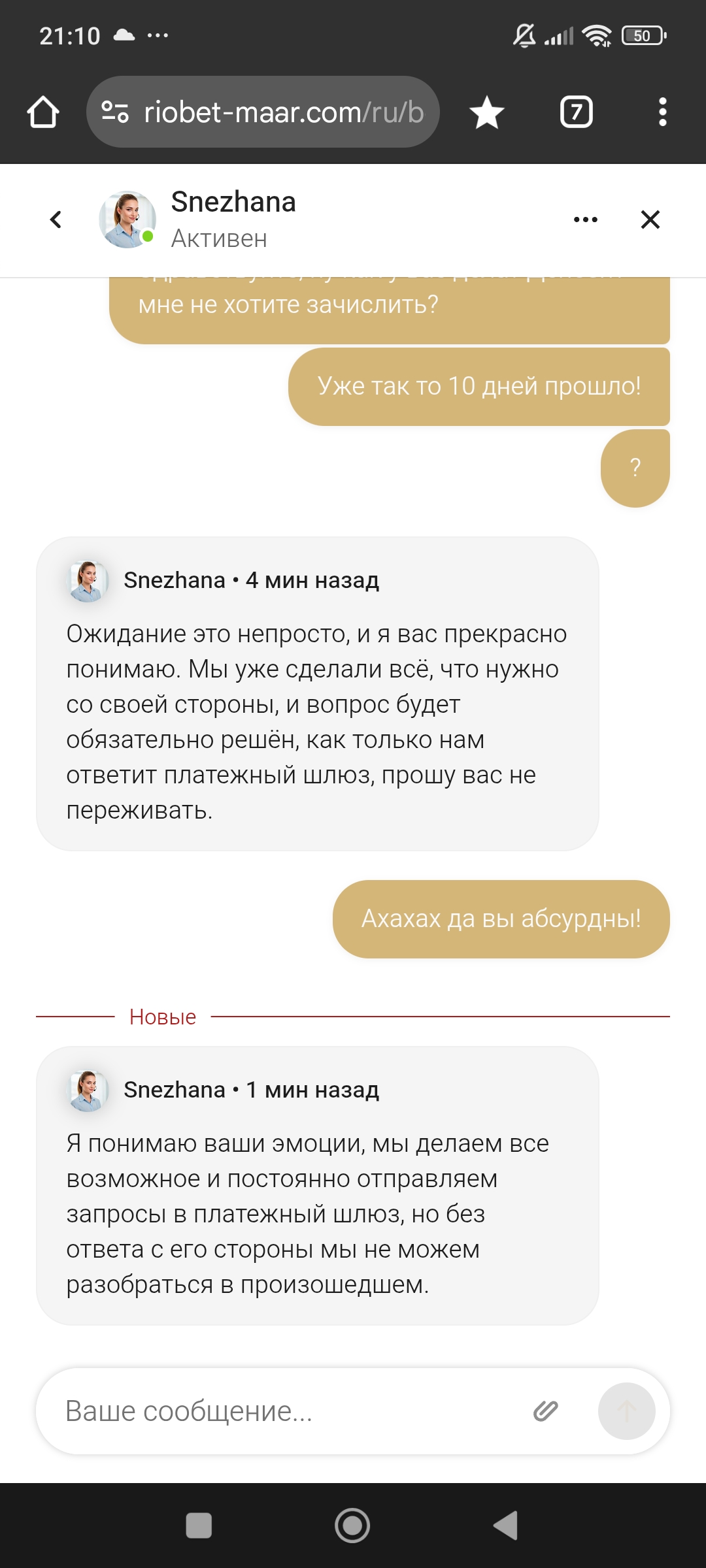 @goldking такая же история,раньше было нормальное отношение персонала, но в один момент они просто скатились в пропасть! Я пол года назад очень сильно дискутировал с всей командой этой конторы! Отношение к игрокам, как к каким-то…. Не знаю как сформулировать!!! Как раз я перестал играть примерно пол года назад,когда начались проблемы с депозитами с карт РФ! Я увидел очень плохое отношение к игрокам и прекратил полностью играть тут! Тебе за твои же деньги ещё умудряются грубить и острить- в голове не укладывается! Щас зашёл проверить, а все стало только хуже!