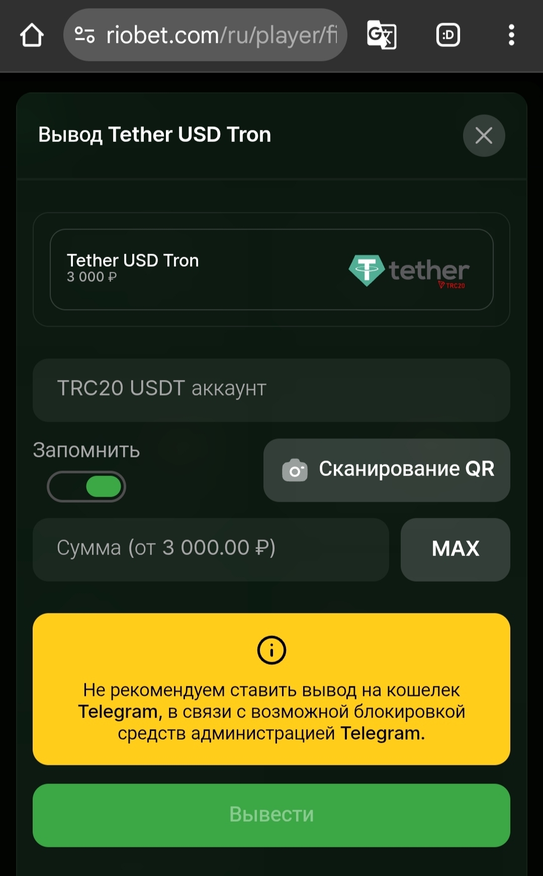 На странице вывода средств на криптовалюту на нашем сайте размещен яркий и чёткий баннер с предупреждением: «Не рекомендуем ставить вывод на кошелек Telegram, в связи с возможной блокировкой средств администрацией Telegram». Эта информация является полностью открытой и доступной для каждого игрока до оформления заявки на вывод.