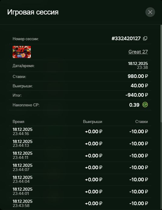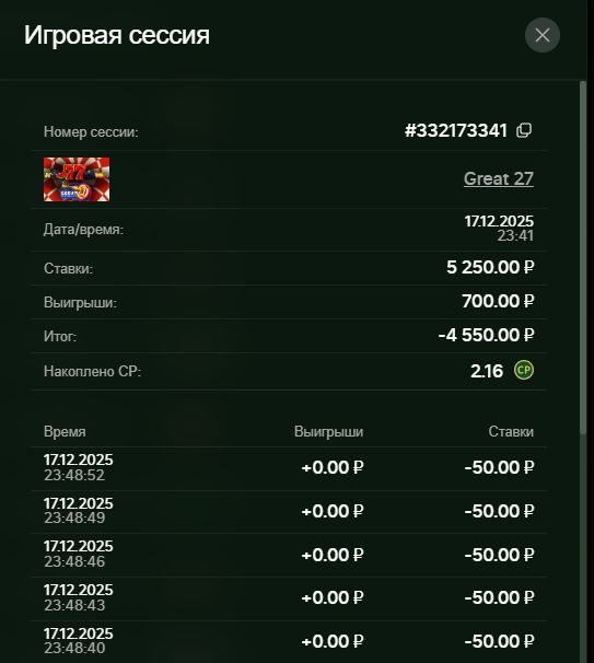 И еще вопрос к представителю славной конторы. Чем вы можете объяснить следующую ситуацию: Вчера игра худо-бедно шла, крутилась какое-то время вокруг депозита, пока я не вошла в турнирную игру. турнир Amusnet, ставки по 50 р. Игра хорошо знакомая и прежде любимая, а именно трехбарабанная Great 27. Глазам не поверила — сделано было 105 ставок, из них выиграли 14. Минус составил 4550 р. За все годы игры такого наглого жора не видела. Игровая сессия 332173341, скриншот прилагаю. Далее, уже сегодня ради интереса зашла опять в эту же игру, но уже по ставке 10. И что мы видим — результат аналогичный. Из 98 ставок выиграло всего 4 (!!!!) Игровая сессия 332420127, скриншот прилагаю. Вы что там творите, можно узнать? турнирные игры отключены по умолчанию, а ваши безголовые работники, которые, как я понимаю, сидят «на кнопке» и должны регулировать отдачу, просто тупо ее отключают. Так? Иначе, чем объяснить подобные результаты, абсолютно одинаковые с разницей в 24 часа. Очень прошу ваших пояснений. Странное совпадение, вам не кажется? Может. сбой какой, может у вас там свет отключили или интернет, или воду, времена-то сейчас знаете, какие. Или