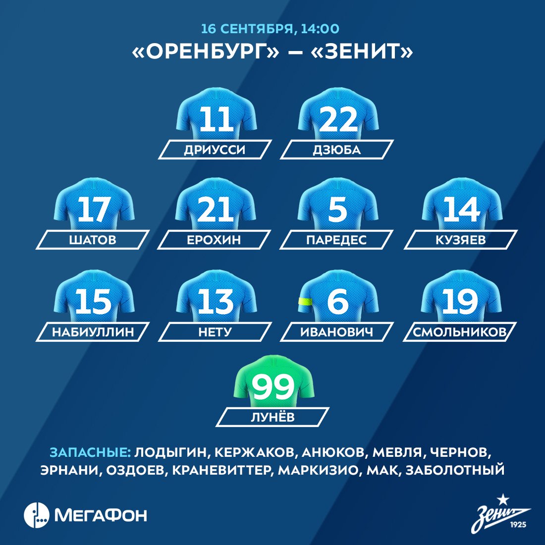 Полностью состав команды Сергея Семака выглядит следующим образом: Лунев (вратарь), Смольников, Иванович, Нету, Набиуллин – Ерохин, Кузяев, Паредес, Шатов – Дзюба, Дриусси