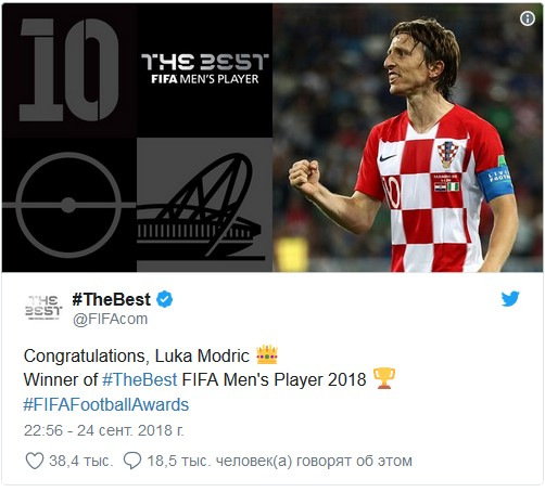 24 сентября в Лондоне прошла церемония награждения ФИФА The Best, на которой приз как лучший игрок получил футболист клуба «Реал» Мадрид и сборной Хорватии Лука Модрич.