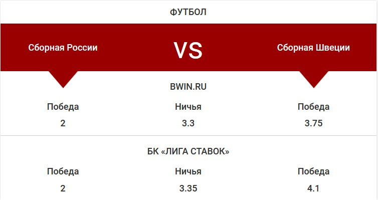 В матче сборных России и Швеции в Лиге наций букмекеры прогнозируют с большей долей вероятности победу хозяев поля. Исходя из коэффициентов, вероятность ничьей выше, нежели победа шведов.