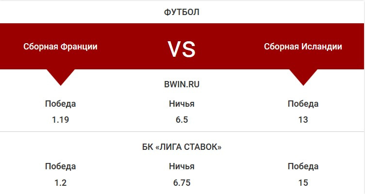 Букмекерские конторы в матче Франция – Исландия прогнозируют победу хозяев. Исходя из коэффициентов, «трехцветные» – абсолютные фавориты в поединке. Вероятность даже ничейного результата в два раза выше возможной победы сборной Исландии.