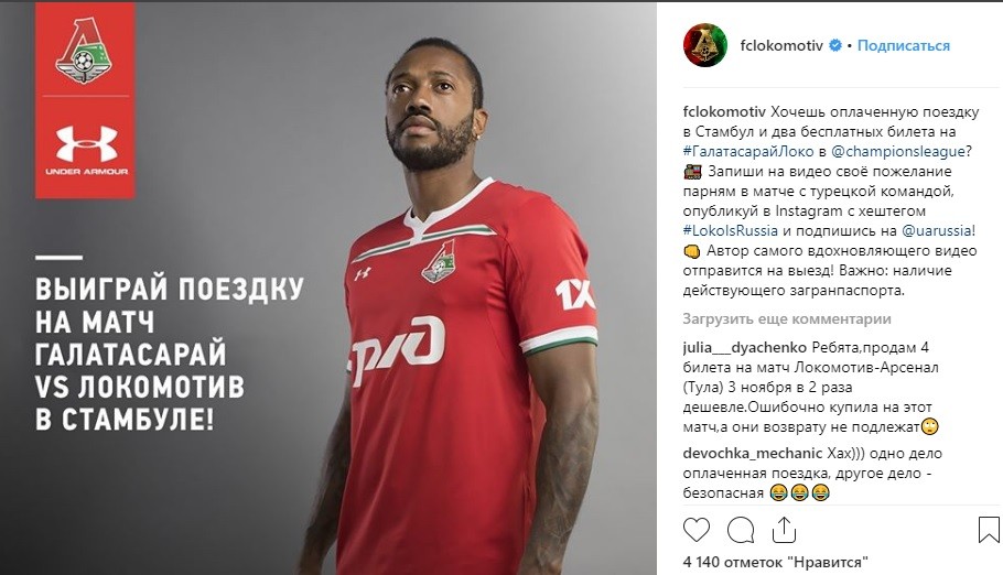 Примером ненавязчивого продвижения стал розыгрыш двух поездок в Стамбул на матч «Локомотива» и «Галатасарая». Пост сопровождает фото игрока в форме «Локомотива» в логотипом «1хСтавка» на рукаве.