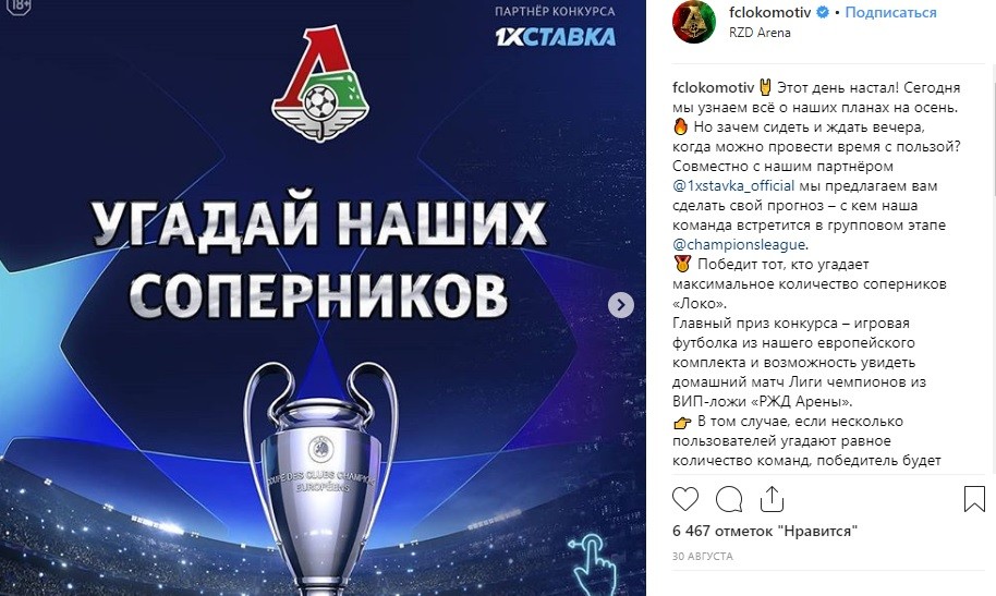 В конкурсе, посвященном жеребьевке Лиги чемпионов, прямо указывалось, что «1хСтавка» является партнером. Подписчикам нужно было угадать в комментариях максимальное количество соперников «Локомотива». Главный приз – игровая футболка из европейского комплекта и приглашение в VIP-ложу «РЖД Арены» на один из домашних матчей ЛЧ.