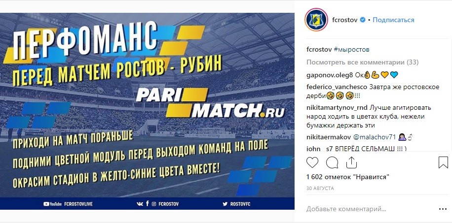По сходной схеме с указанием имени беттинг-партнера провели акцию на странице «Краснодара» в Instagram. Разыграли билеты на VIP-трибуну на матч «Локомотив»-«Краснодар». Это был традиционный масс-фоллоуинг с двумя требованиями: быть подписчиком аккаунтов «Краснодара» и «1хСтавка» и отметить в комментариях одного друга. Победитель определялся не через рандомайзер – по два билета получили авторы двух первых комментариев после комментария «СТОП» от клубного аккаунта.