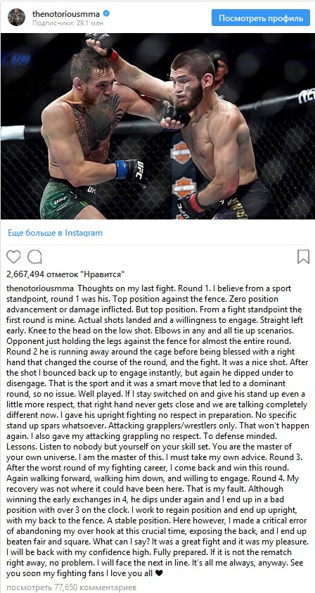 «Печально известный» считает, что в течение поединка у него были шансы победить и временами все шло по его сценарию. Первый раунд со спортивной точки зрения он проиграл, так как Хабибу удалось перевести бой моментально в партер. Но в тоже время, по словам Конора, урона ему это не наносило, а у него самого проходили удары с колена и локтя. Во втором раунде Макгрегор контролировал ход поединка и заставил Нурмагомедова убегать от него, но вскоре сам совершил главную ошибку — пропустил хороший встречный удар.