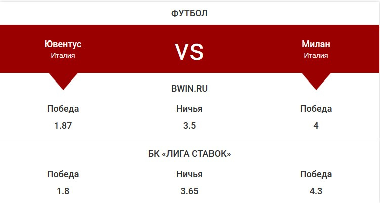 Прогнозы букмекеров на матч «Милан» — «Ювентус» 11 ноября