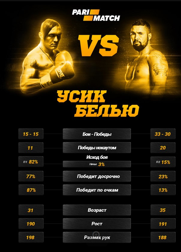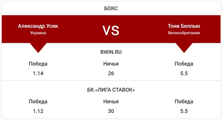 Букмекерские конторы считают, что в предстоящем поединке Усик – Беллью 2018 больше шансов на победу у украинца. Александр моложе, быстрее и своей карьерой заслуженно доказал, что на данный момент он лучший в своем дивизионе.