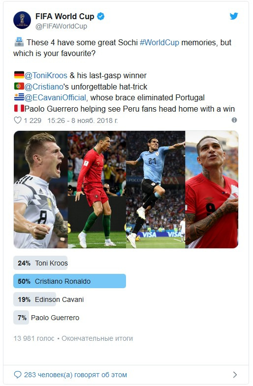 Респондентами на странице FIFA стал 13 981 футбольный болельщик. 50% всех проголосовавших посчитали самым запомнившимся событием именно хет-трик португальца в первом туре чемпионата мира.