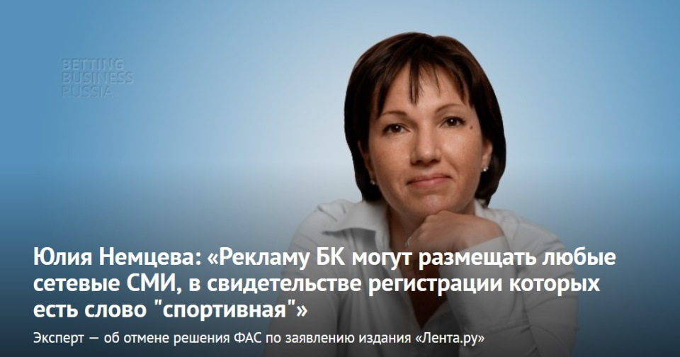 Юлия Немцева: «Рекламу БК могут размещать любые сетевые СМИ, в свидетельстве регистрации которых есть слово «спортивная»»