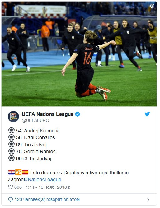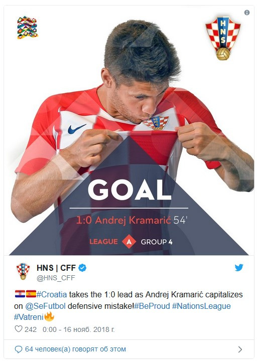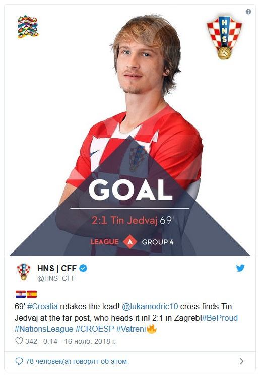 Под конец игры хорваты пошли в отчаянный штурм в надежде додавить противника. После очередной передачи мяч попал к Перишичу, который отпасовал на Брекало. Удар в дальний угол, голкипер парирует неудобный прыгающий мяч, но он отлетает прямо на ногу набежавшего Тина Едвая, который оформил дубль в этой встрече – 3:2.