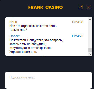 Я не играю по большим ставкам и не лудоман как видимо вы, играю изредка года 3-4, но у меня складывается впечатление уже что вы точно из поддержки франк казино)))