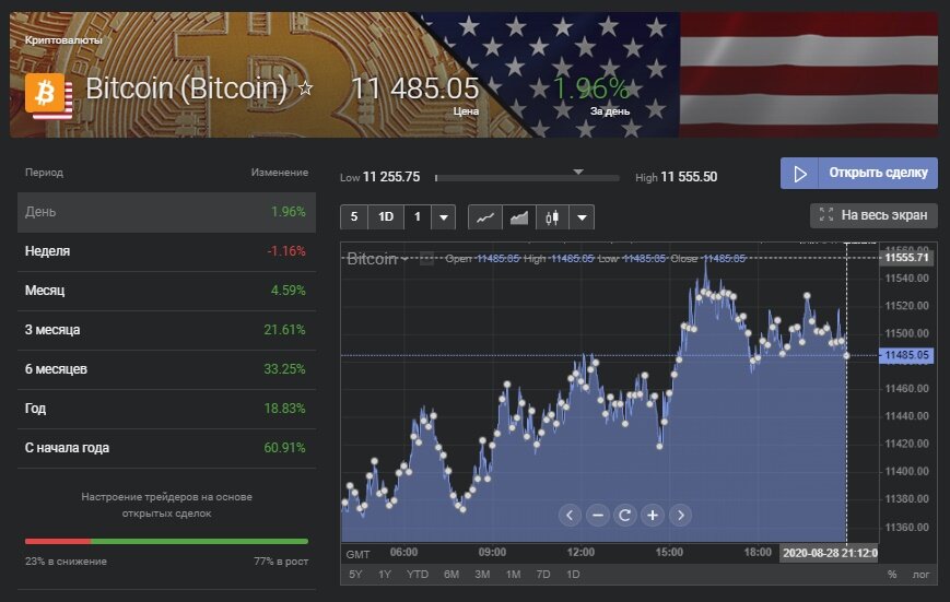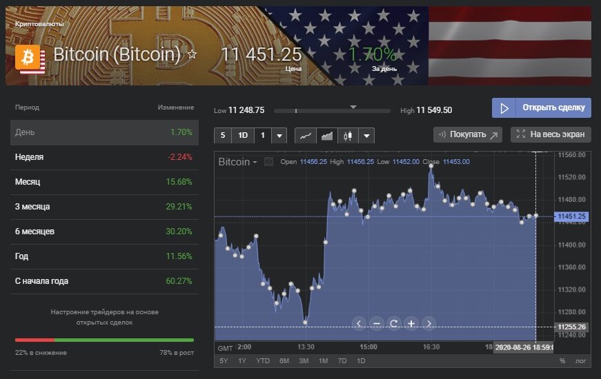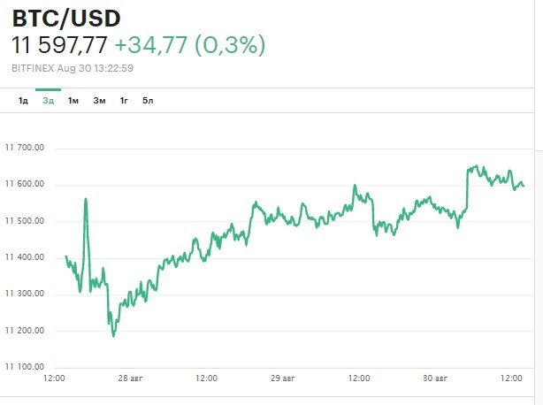 В пятницу, 28 августа, цена биткоина растет. На 09:30 МСК первая криптовалюта торгуется на уровне $11 425,21 (+0,25%), по данным CoinMarketCap.
