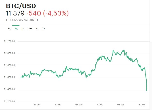 По данным портала CoinMarketCap, высчитывающего среднюю цену более чем по 20 биржам, по состоянию на 10.31 мск биткоин дешевел на 0,59% — до 11808 долларов. На крупнейшей по объему торгов криптовалютами бирже Binance биткоин опускался в цене на 0,74% — до 11774 долларов. На долю биткоина приходится примерно 56,5% рынка.