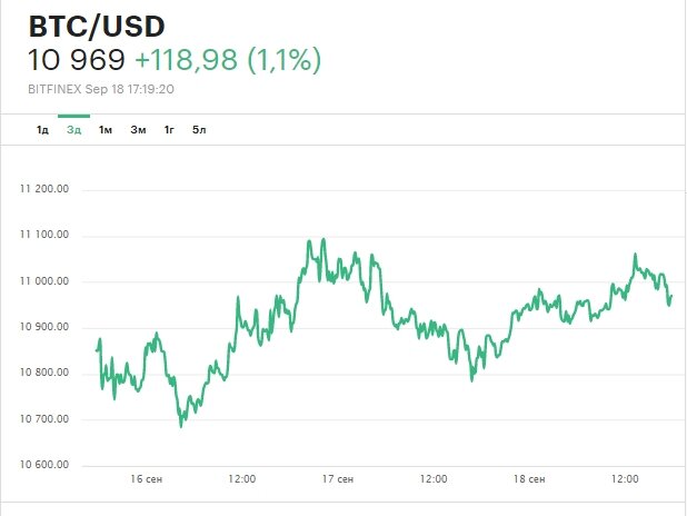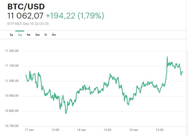 Курс биткоина поднялся выше отметки в $11 000. Два дня назад, вечером 16 сентября, стоимость монеты тестировала этот уровень, но не смогла преодолеть, поэтому откатилась ниже $10 800. За прошедшие сутки первая криптовалюта подорожала на 0,9%, с начала сентября — на 10%.