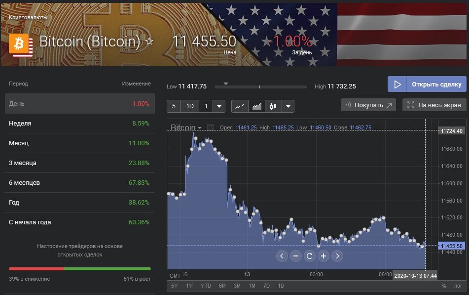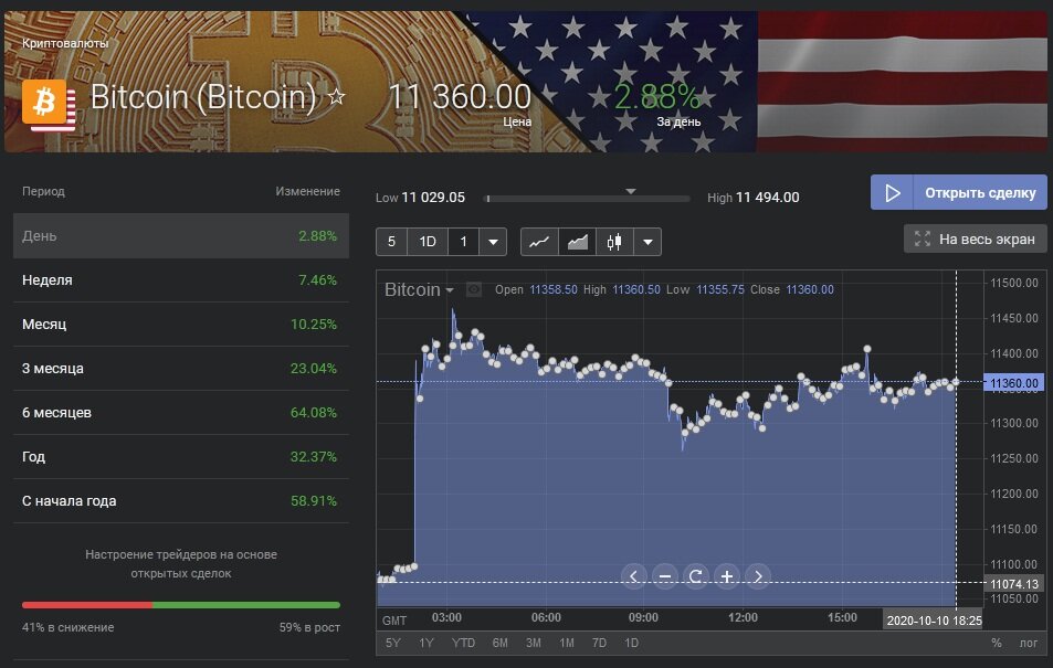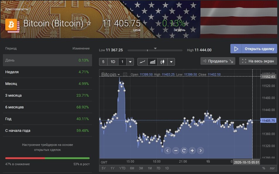 В выходные стоимость первой криптовалюты поднималась выше $11 400. С 8 октября она подорожала почти на 8%