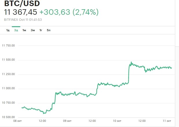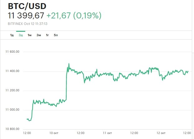 В прошедшие выходные курс биткоина достиг максимума со 2 сентября в $11 424. За последние два дня стоимость первой криптовалюты несколько раз поднималась выше отметки в $11 400, после чего снова опускалась ниже нее. На данный момент главная цифровая монета торгуется на уровне в $11 370, за последние 24 часа она подорожала на 0,4%, с 8 октября — почти на 8%.