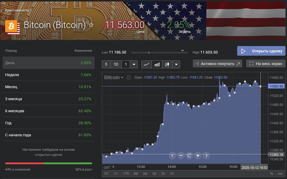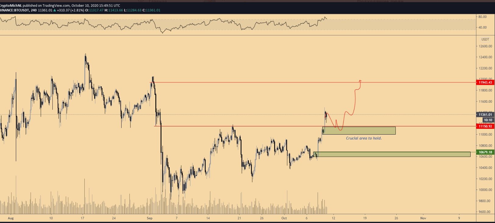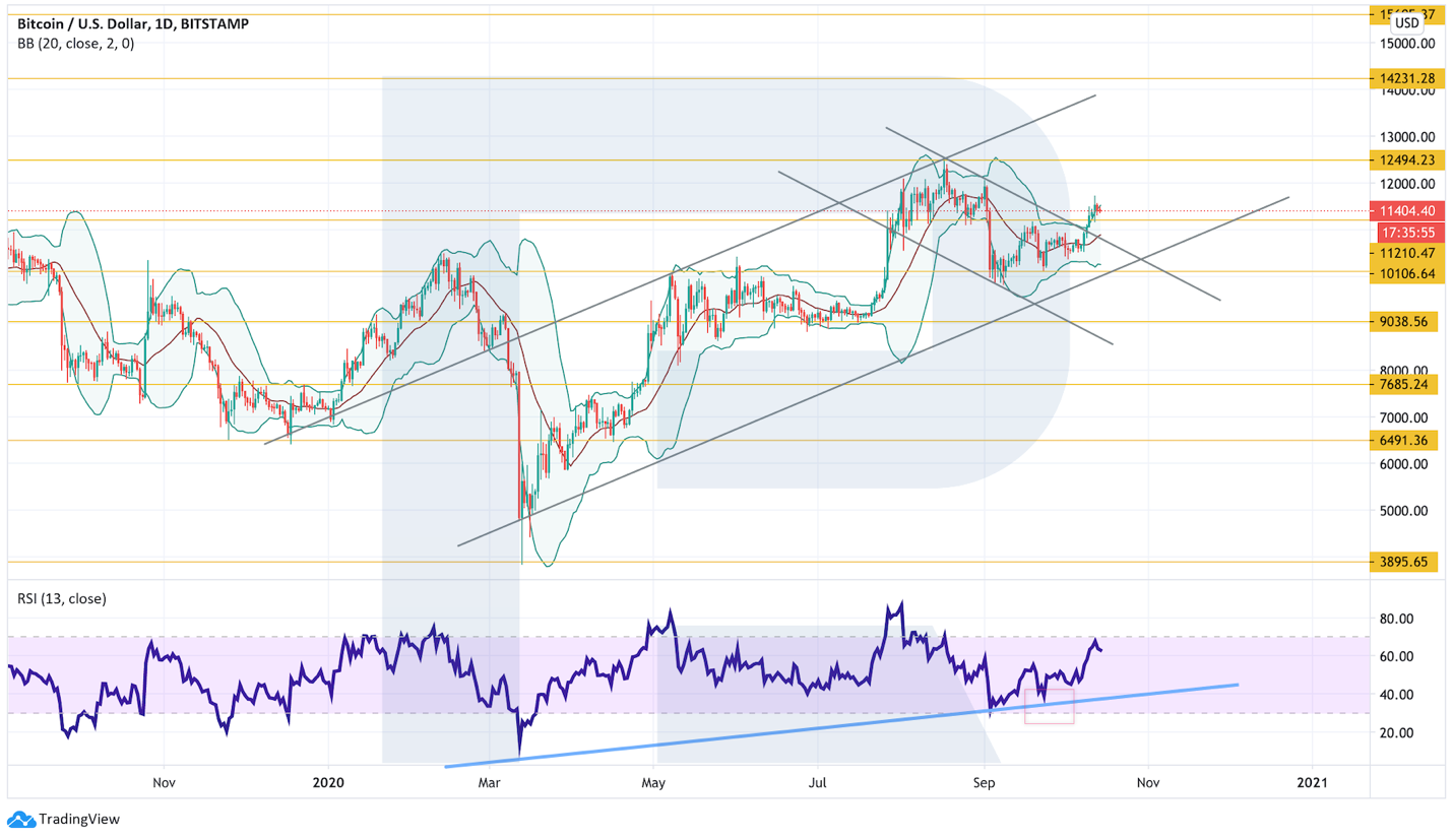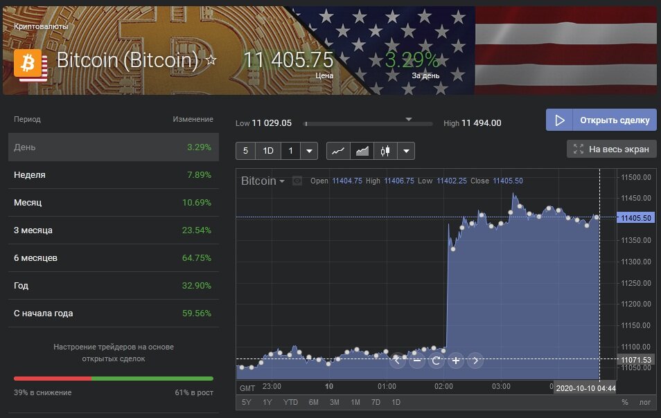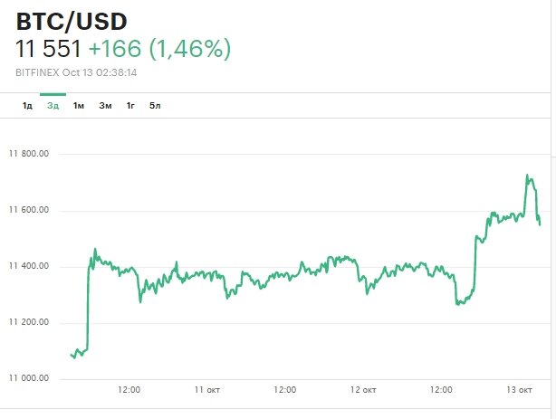 В ночь на субботу, 10 октября, цена первой криптовалюты пробила обозначенный ранее многими аналитиками уровень сопротивления на отметке в $11 200, в моменте вплотную подобравшись к $11 500.