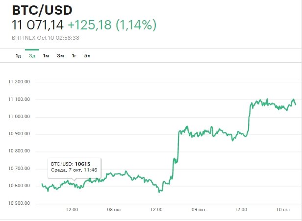 Курс биткоина впервые с 20 сентября поднялся выше $11 000, за 24 часа увеличившись на 3,5%. Суточный объем торгов монетой, наоборот, снизился на 37% и теперь составляет $36 млрд. Доля BTC на рынке криптовалют выросла до 58,4%.