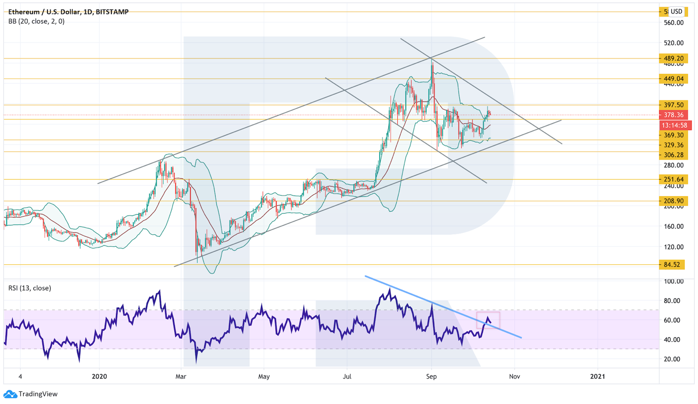 На дневном графике котировки пробили верхнюю границу коридора, в котором актив был «зажат» долгое время, и закрепились над уровнем $11 200. Здесь же состоялось преодоление верхней границы нисходящего канала, что указывает на желание рынка двигаться вверх дальше, к уровню $12 495. Дополнительным сигналом в пользу роста цены выступает то, что значения индикатора RSI тоже отталкиваются от восходящей линии тренда. Однако покупателям важно закрепиться над уровнем $12 495, в противном случае с пробоем $10 105 может состояться полное завершение разворотной модели «Голова и плечи», где конечной целью паттерна станет уровень $7000.