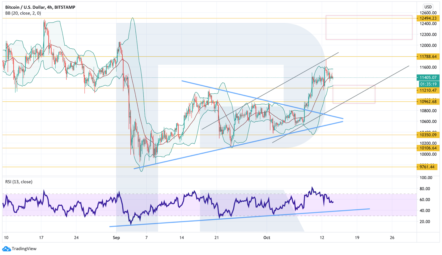 На 4-часовом графике котировки смогли покинуть пределы модели «Треугольник». Есть все шансы увидеть продолжение роста цены в рамках ее отработки. Дополнительным сигналом в пользу такого варианта выступят отскоки от нижней границы восходящего канала и поддержки на индикаторе RSI. Как видим, предыдущий тест трендовой линии на графике индикатора спровоцировал качественный отскок цены вверх. Отменой указанного варианта может стать пробой нижней границы восходящего канала с закреплением цены под уровнем $10 960, что укажет на ее дальнейшее снижение к уровню $10 350.