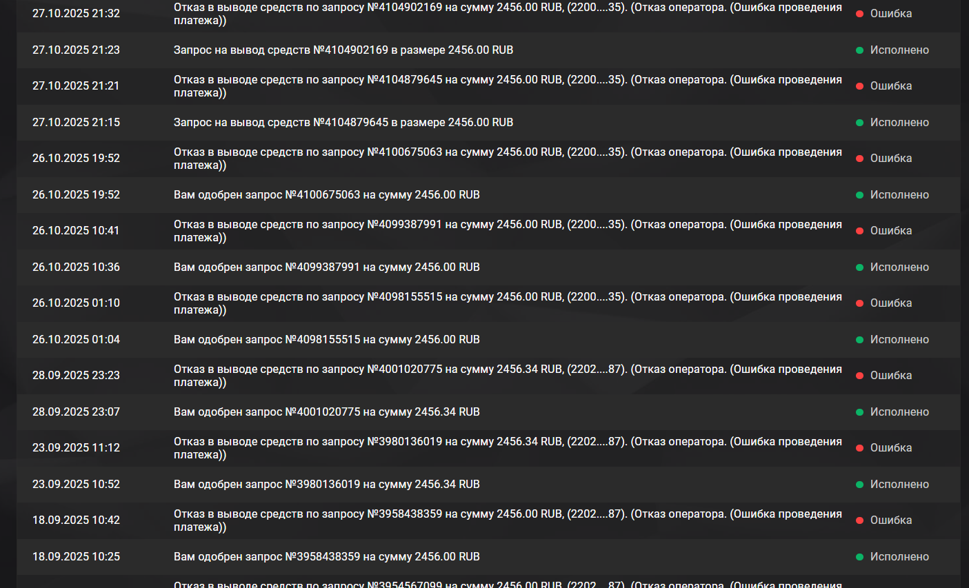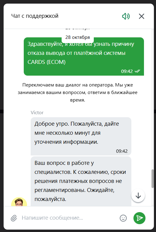 Отговорки по базе. Мы на своей стороне всё подтвердили, а платёжная система отклоняет. Хотя можно увидеть, что отклонение с ошибкой приходит за 5-10 мин, что не свойственно для платёжек (ещё были 2-3 вывода с подтверждением через тп, но там буквально моментально приходили отмены платёжного оператора).