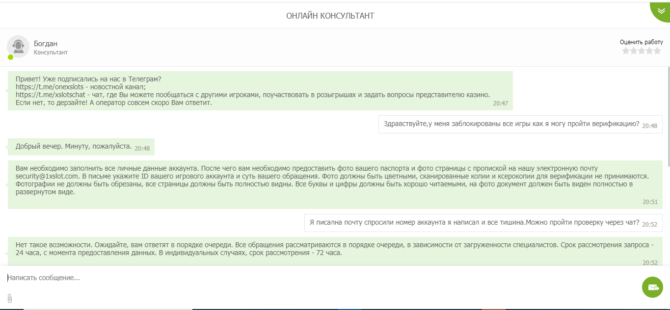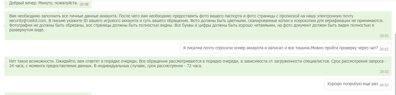 Хочу расказать свою историю связанную с 1xslots.Вообщем как то выложили промик на одном из форумов ну я и регнулся в этом казино ввел промик что то насыпало с фриспинов и я начал играть дальше.Как оказалось позднее это была ошибка сайта и деньги с фриспинов нужно было отыгрывать за свой,скажу еще раз вагер я не отмыл депозитов и выводов не делал никогда в этом казино.Ну и что происходит дальше,слоты у меня все заблокировали.обратившись в ТП я спросил в чем дело на что мне ответили что нужно пройти верификацию.цЯ забил на это дело и вышел.Сегодня выйграл бездепозитный промокод в этом казино.Ну думаю пришло время пройти проверку.Написал на почту номер счета и отправил документы на что не за долго после этого получил ответ