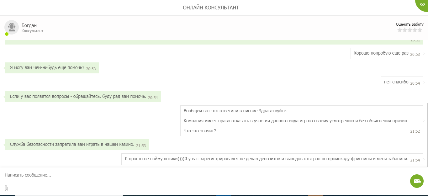 Может вёл какую-то подозрительную активность? Типа при игре в первые фри спины использовал какую-то систему для отбития, или айпи засветилось у другого игрока, вот и послали для избежания проблем в дальнейшем.