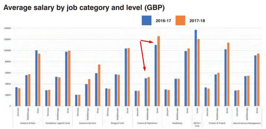 В отчете предлагались разные направления и три категории позиций (исполнители, менеджмент среднего звена и высшего звена). Если брать в общем, то больше всего на данный момент зарабатывают сотрудники отделов Финансы и Производство. В год средняя зарплата топ 10% высшего звена составляет 232,000 фунтов, что в месяц составляет 19.33 тысячи фунтов.