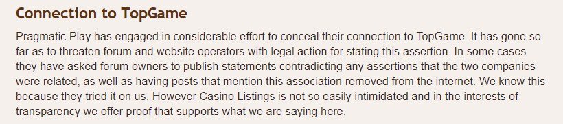 В 2008 году появился разработчик TopGame, который позже и превратился в Pragmatic Play. По словам Casino Listings, эту связь они упорно отрицают и даже требовали убрать информацию, которая связывает эти два бренда. Вот что пишет на этот счет Casino Listings: