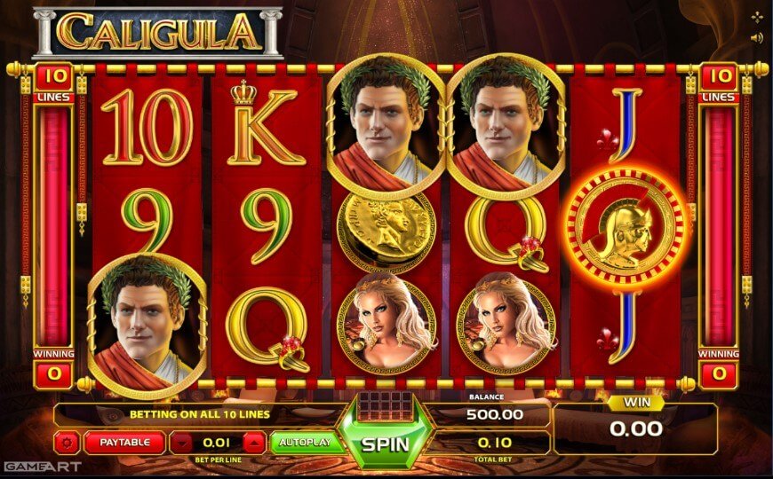 Слот Caligula приглашает примерять на себя доспехи римского императора Калигулы, чья героическая жизнь легла в основу сюжета видеослота. Цветовая гамма выполнена в классических цветах Римской империи: красный и золотой.