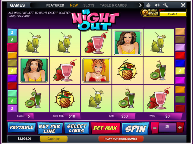 Рассмотрим самый популярный видео слот эротического характера, A Night Out (Ночь развлечений), само название которого предполагает пикантный подтекст. Игра начинается в ночном клубе c красивыми девушками, желающими обрести новые знакомства. Этот игровой автомат доступен, как в режиме бесплатной игры, так и в режиме игры на реальные деньги – выбор предоставляется игроку. Могу сказать точно, что игра на “фишки” быстро надоедает, так что вы быстро приступите к варианту, который позволяет заработать.