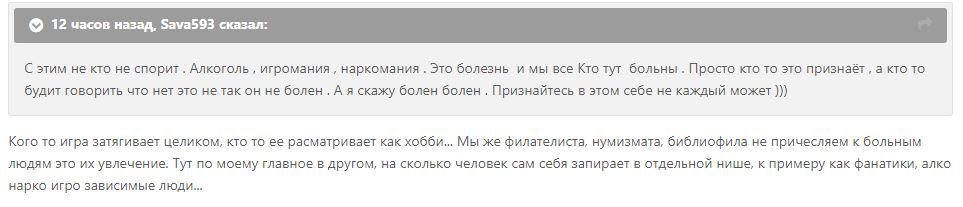 А в данном конретном случае говорил за тех кто «возомнил себя исключительным», в плане игры, но походу таким не является. По этому и забился в свой придуманный мирок и типа живет там, прожигая свою жизнь, выгорая изнутрииграя. Играя сначала на свои потом на деньги родственников, потом на то шо взял в «других», но со временем уже не всостоянии вернуть. Так и катятся по наклонной, изменить свою жизнь не хотят, для них это стала их зоной «комфорта». Вот за таких лудоманов, аконавтов и наркош говорил… Их всех можно смело отнести к фанатикам, ибо не ведают шо творят.