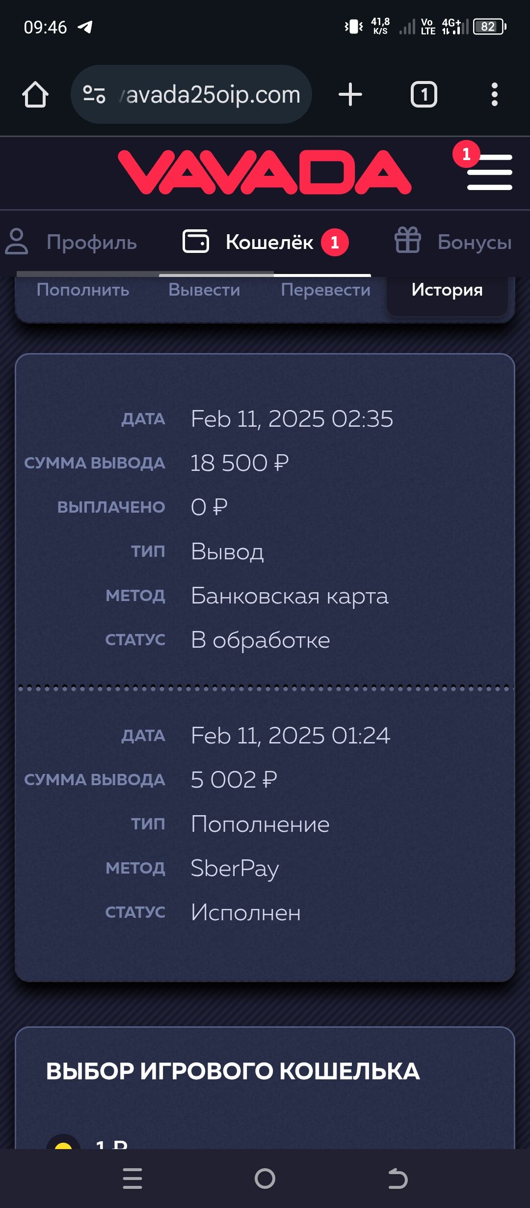 вавада не выводит депозит, статус в обработке стоит с 11 числа, вывод был совершён в 2ч ночи , сегодня уже 12