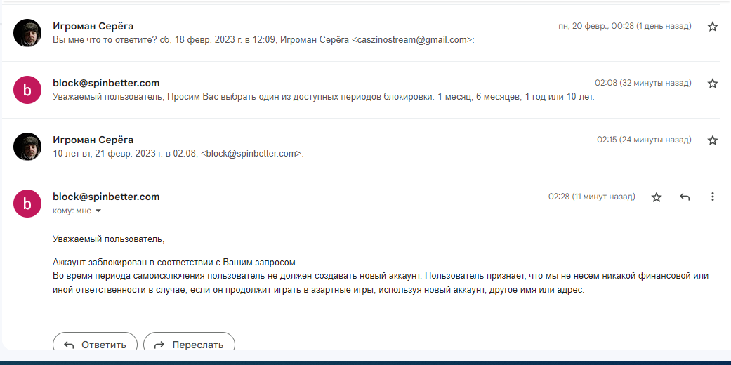 Первое за всю историю казино в котором я заблокировался.Обьясню причины 1.Абсолютно неадекватные Тп на сайте.Второе у казино нет средней игры слотов либо они все жрут просто в 0 что бывает чаще всего то играют как бешенные что очень редко ну и третье постоянные обманы с бонусами последнии бонус прислали 15 февраля в 17.45 в почту я зашел только 16 го увидел бонус от Лины депаешь 500р отвечаешь на письмо 25 фриспинов без вагера.Зашел депнул а спинов нет пишу на почту ответа нет пишу в телеграм мне отвечают что акция действительна с 15-16 февраля то есть время на активацию было всего 6 часов 15 минут так как оказалось что если они пишут с 15-16 февраля 16 не включено.И таких ситуции просто море.За всю историю игры в казино был только 1 раз положительный момент это когда я в гонке выйграл фриспины а мне дали 2200 на баланс без вагера.