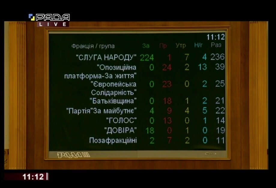 За соответствующий проект закон №2285-д во втором чтении и в целом отдали свои голоса 248 депутатов при минимально необходимых 226. Поддержали законопроект 224 депутата из фракции «Слуги народа», 18 – из группы «Довіра», четверо – из группы «Партия «За майбутнє» и двое внефракционных. «Оппозиционная платформа – За жизнь», «Европейская солидарность», «Батьківщина» и «Голос» не дали ни одного голоса.