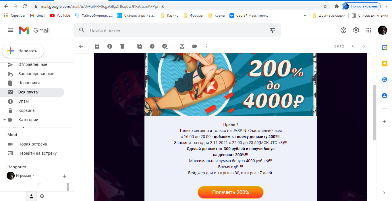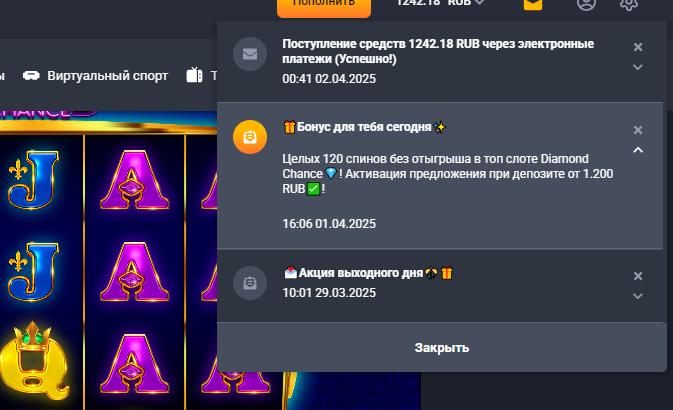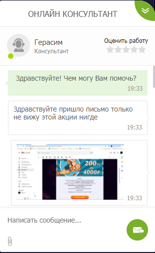 Прислали на почту предложение дня-100 фриспинов за депозит 1200 рублей. В моём аккаунте на вкладке «Бонусы» этого предложения нет.Только сообщение в углу сайта,без ссылки на условия этого бонуса.Я спросил в саппорте-они подтвердили,что депайте ,оно будет.
