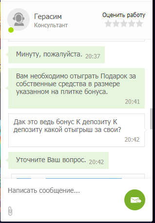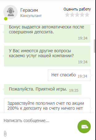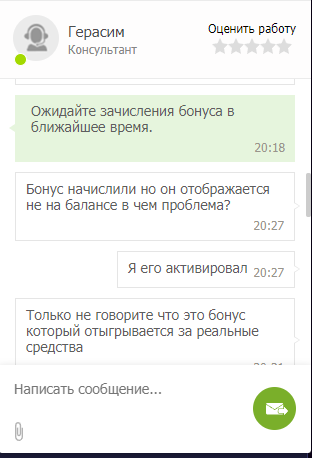 Вчера получил письмо, внёс депозит, бонуса не получил, в чате сказали ещё раз подтвердить номер телефона, подтвердил, в начислении бонуса было отказано, со слов чата, что я не активный игрок. Вопрос, зачем такой чат нужен? По вашему это норма, когда игрок обращается за помощью, а его в открытую обманывают работники чата. Заранее скажу, бонус паки с вейджерами за свои, меня не интересуют.