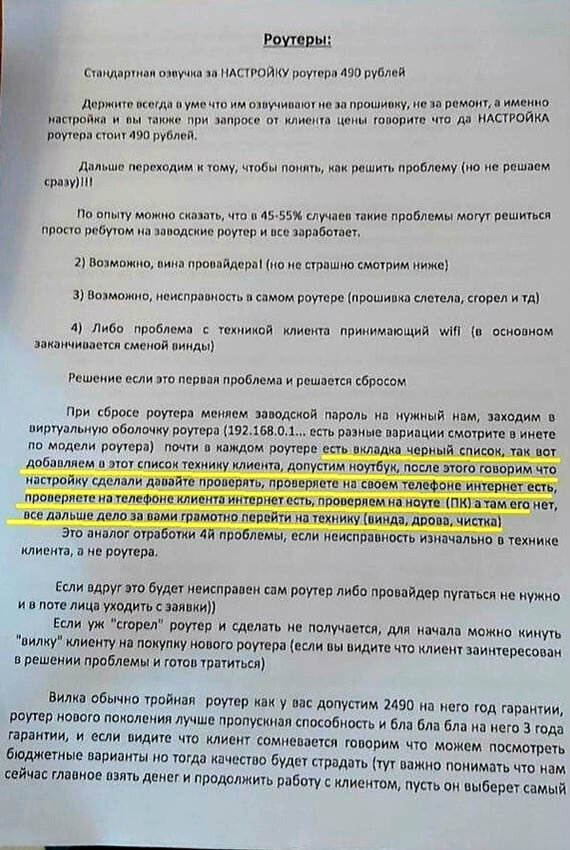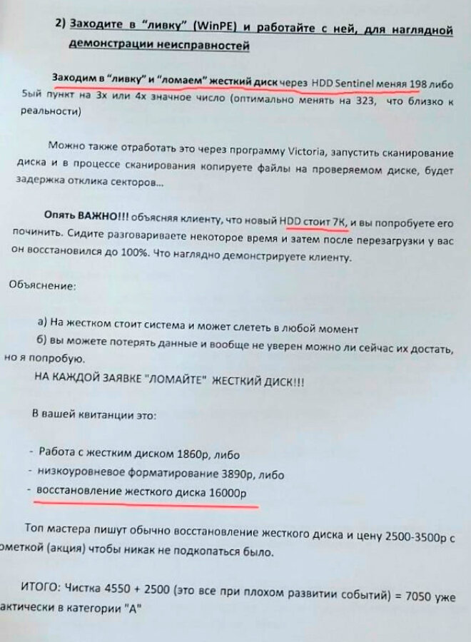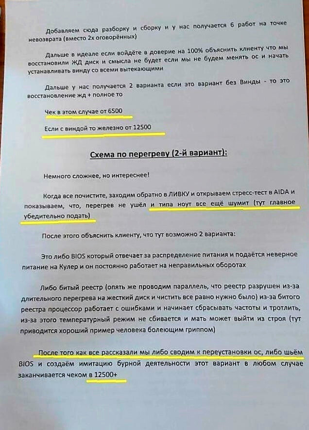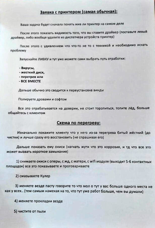 Сотрудников подобных ремонтных центров учат искусственно завышать стоимость банальных услуг, таких как переустановка системы, или проверка кулера. В инструкции четко прописаны шаги, благодаря которым не разбирающийся в технике клиент поверит в серьезную проблему со своим ноутбуком.