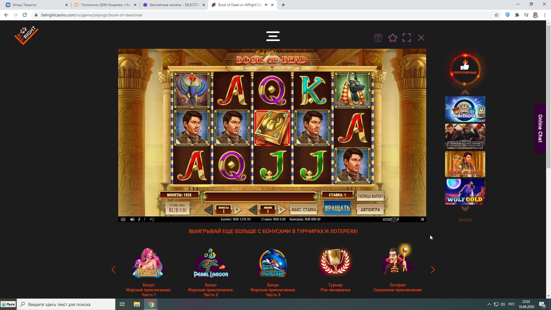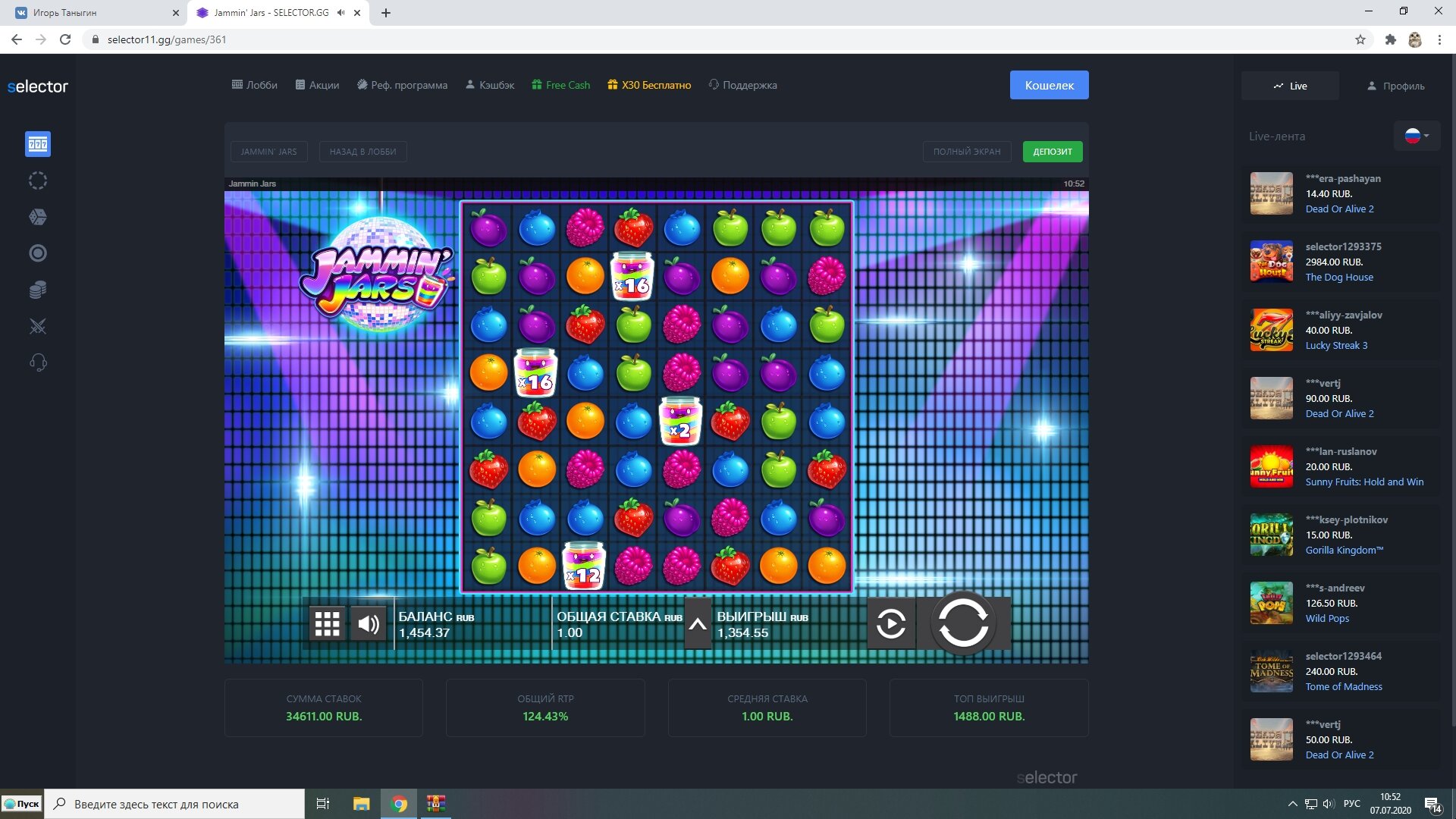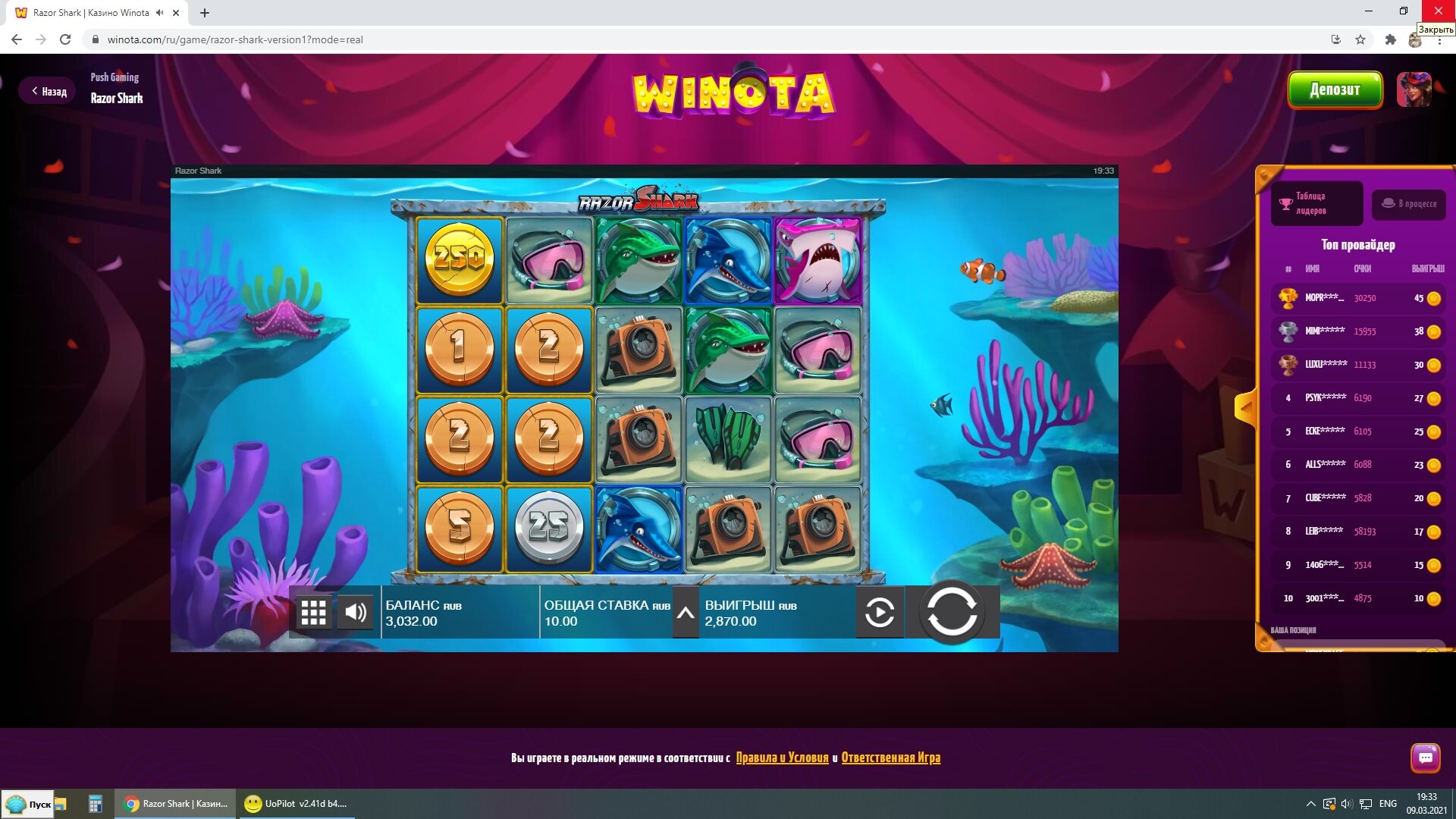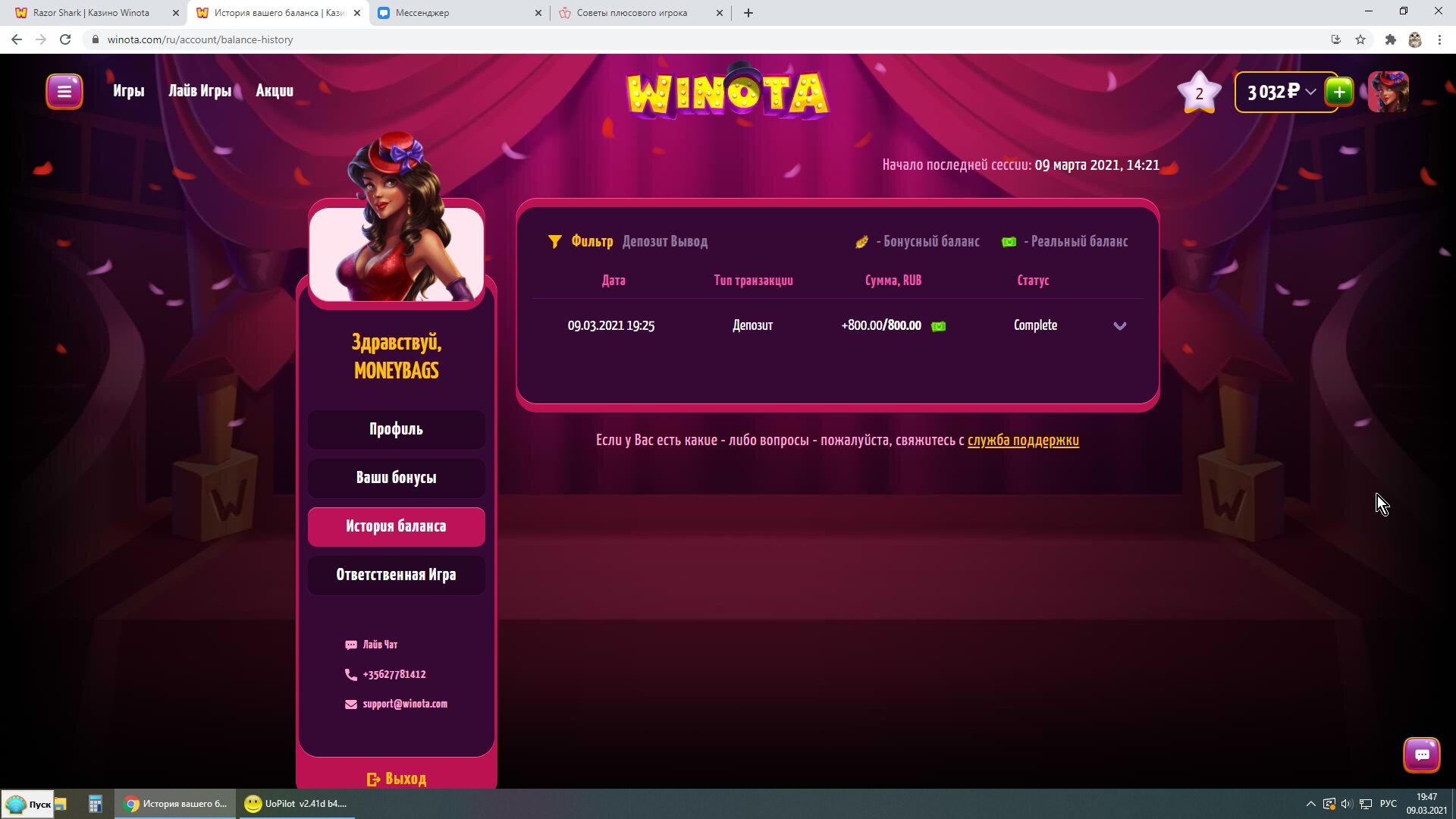 Вот наглядный пример как я делаю плюс в казино.Сегодня нашел новое казино WINOTA. Пополнил через экопейз 800 рублей. И зашел в RAZOR SHARK.На балансе оставалось около 200 рублей получаю существенный плюс за счет монет.Следующие мои действия сохранить без больших потерь баланс и вывести. А так как получил выигрыш после примерно спинов на сумму 500 рублей, то вычисляю что при депозите 800 рублей мне нужно ставок на 2400.На 500 рублей я уже сделал ставки.Остается всего 1900 рублей.Правильное решение идти в низкодисперсионный слот и отмыть вагер х3 на депозит.Дальше напишу итоги отмыва.