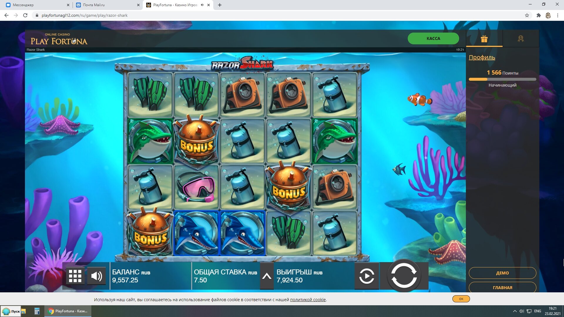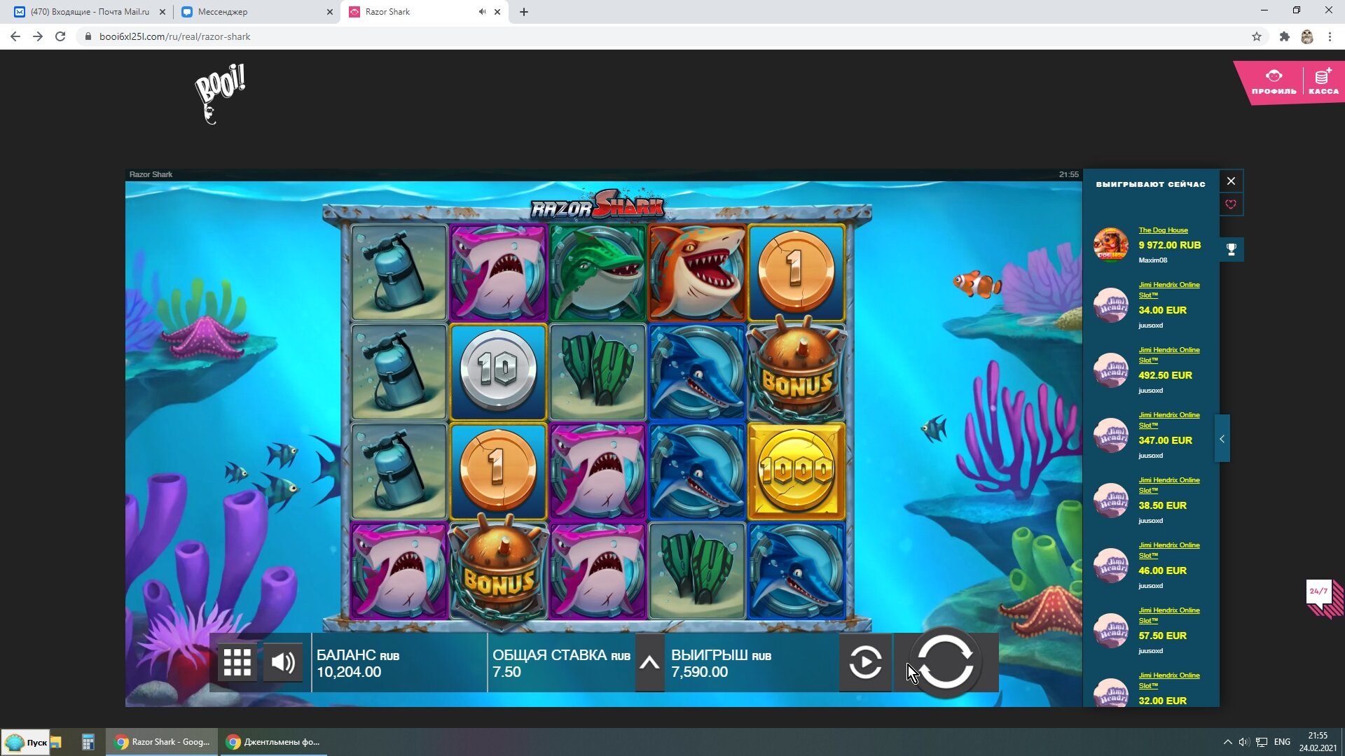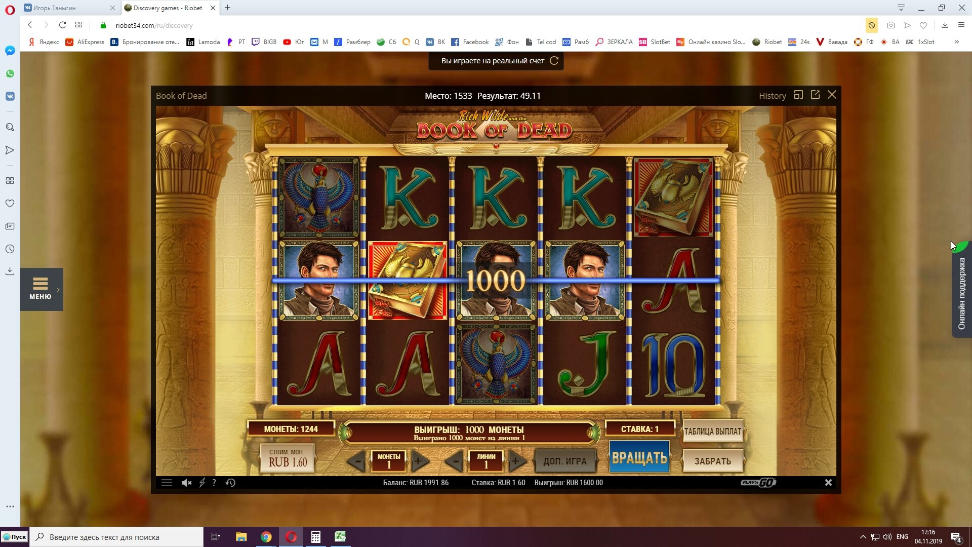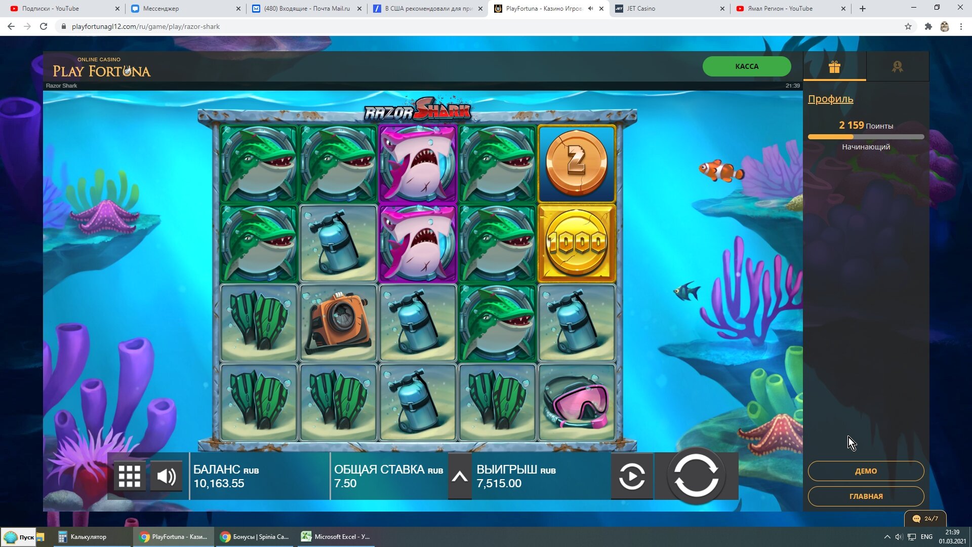 Вот наглядный пример как я делаю плюс в казино.Сегодня нашел новое казино WINOTA. Пополнил через экопейз 800 рублей. И зашел в RAZOR SHARK.На балансе оставалось около 200 рублей получаю существенный плюс за счет монет.Следующие мои действия сохранить без больших потерь баланс и вывести. А так как получил выигрыш после примерно спинов на сумму 500 рублей, то вычисляю что при депозите 800 рублей мне нужно ставок на 2400.На 500 рублей я уже сделал ставки.Остается всего 1900 рублей.Правильное решение идти в низкодисперсионный слот и отмыть вагер х3 на депозит.Дальше напишу итоги отмыва.